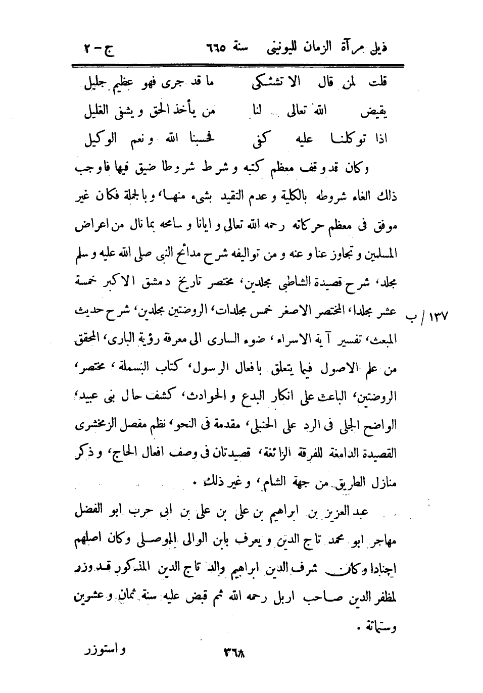 وكان قد وقف معظم كتبه وشرط شروطاً ضيق فيها فأوجب ذلك الغاء شروطه بالكلية وعدم التقيد بشيء منها، وبالجملة فكان غير موفق في معظم حركاته رحمه الله تعالى وإيانا وسامحه بما نال من أعراض المسلمين وتجاوز عنا وعنه ومن تواليفه شرح مدائح النبي صلى الله عليه وسلم مجلد، شرح قصيدة الشاطبي مجلدين، مختصر تاريخ دمشق الأكبر خمسة عشرة مجلداً، المختصر الأصغر خمس مجلدات، الروضتين مجلدين، شرح حديث المبعث، تفسير آية الإسراء، ضوء الساري إلى معرفة رؤية الباري، المحقق من علم الأصول فيما يتعلق بأفعال الرسول، كتاب البسملة، مختصر، الروضتين، الباعث على إنكار البدع والحوادث، كشف حال بني عبيد، الواضح الجلي في الرد على الحنبلي، مقدمة في النحو، نظم مفصل الزمخشري القصيدة الدامغة للفرقة الزائغة، قصيدتان في وصف أفعال الحاج، وذكر منازل الطريق من جهة الشام، وغير ذلك.