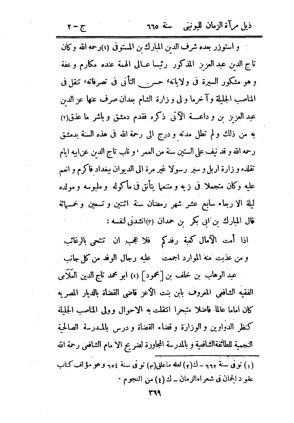 واستوزر بعده شرف الدين المبارك بن المستوفي رحمه الله وكان تاج الدين عبد العزيز المذكور رئيساً عالي الهمة عنده مكارم وعفة وهو مشكور السيرة في ولاياته، حسن التأني في تصرفاته، تنقل في المناصب الجليلة وآخر ما ولى وزارة الشام بعد أن صرف عنها عز الدين عبد العزيز بن وداعة الآتي ذكره فقدم دمشق وباشر ما عذق به من ذلك ولم تطل مدته ودرج إلى رحمة الله في هذه السنة بدمشق رحمه الله وقد نيف على الستين سنة من العمر، وناب تاج الدين عن أبيه أيام تقلده وزارة إربل وسير رسولاً غير مرة إلى الديوان ببغداد فأكرم وأنعم عليه وكان متجملاً في زيه ومتنعماً يتأنق في مأكوله وملبوسه ومولده ليلة الأربعاء سابع عشر شهر رمضان سنة اثنتين وتسعين وخمسمائة قال المبارك بن أبي بكر بن حمدان أنشدني لنفسه: