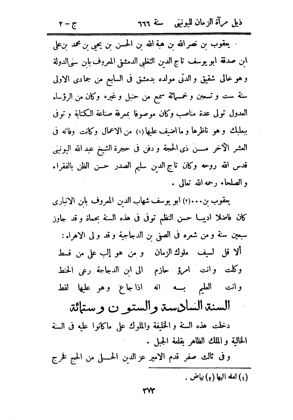 يعقوب بن نصر الله بن هبة الله بن الحسن بن يحيى بن محمد بن علي ابن صدقة أبو يوسف تاج الدين التغلبي الدمشقي المعروف بابن سنى الدولة وهو خالي شقيق والدتي مولده بدمشق في السابع من جمادى الأولى سنة ست وتسعين وخمسمائة سمع من حنبل وغيره وكان من الرؤساء العدول تولى عدة مناصب وكان موصوفاً بمعرفة صناعة الكتابة وتوفي ببعلبك وهو ناظرها وما أضيف عليها من الأعمال وكانت وفاته في العشر الآخر من ذي الحجة ودفن في حجرة الشيخ عبد الله اليونيني قدس الله روحه وكان تاج الدين سليم الصدر حسن الظن بالفقراء والصلحاء رحمه الله تعالى.