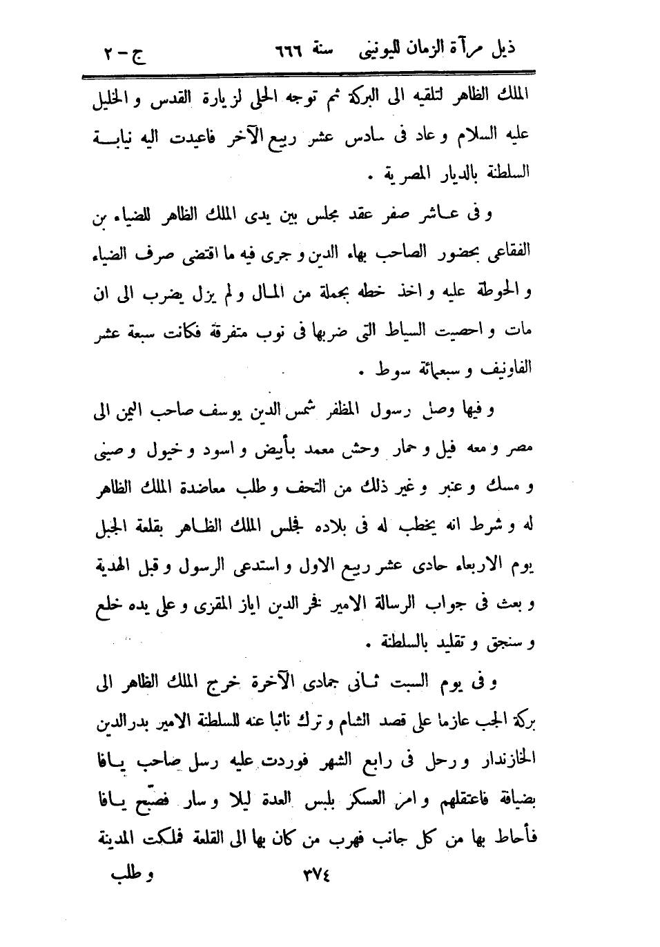 وفي عاشر صفر عقد مجلس بين يدي الملك الظاهر للضياء بن الفقاعي بحضور الصاحب بهاء الدين وجرى فيه ما اقتضى صرف الضياء والحوطة عليه وأخذ خطه بجملة من المال ولم يزل يضرب إلى أن مات وأحصيت السياط التي ضربها في نوب متفرقة فكانت سبعة عشر الفاونيف وسبعمائة سوط.