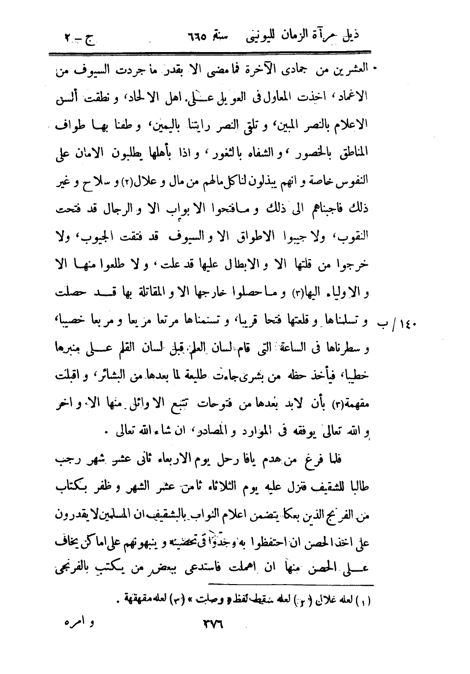 العشرين من جمادى الآخرة فما مضى إلا بقدر ما جردت السيوف من الإغماد، أخذت المعاول في العويل على أهل الإلحاد، ونطقت ألسن الأعلام بالنصر المبين، وتلقى النصر رايتنا باليمين، وطفنا بها طواف المناطق بالخصور، والشفاه بالثغور، وإذا بأهلها يطلبون الأمان على النفوس خاصة وإنهم يبذلون لنا كل ما لهم من مال وعلال وسلاح وغير ذلك فأجبناهم إلى ذلك وما فتحوا الأبواب إلا والرجال قد فتحت النقوب، ولا جيبوا الأطواق إلا والسيوف قد فتقت الجيوب، ولا خرجوا من قلتها إلا والابطال عليها قد علت، ولا طلعوا منها إلا والأولياء إليها وما حصلوا خارجها إلا والمقاتلة بها قد حصلت وتسلمناها وقلعتها فتحاً قريباً، وتسنمناها مرتعاً مريعاً ومربعاً خصيباً، وسطرناها في الساعة التي قام لسان العلم قبل سان القلم على منبرها خطيباً، فيأخذ حظه من بشرى جاءت طليعة لما بعدها من البشائر، وأقبلت مقهمة بأن لا بد بعدها من فتوحات تتبع الأوائل منها الأواخر والله تعالى يوفقه في الموارد والمصادر، إن شاء الله تعالى.