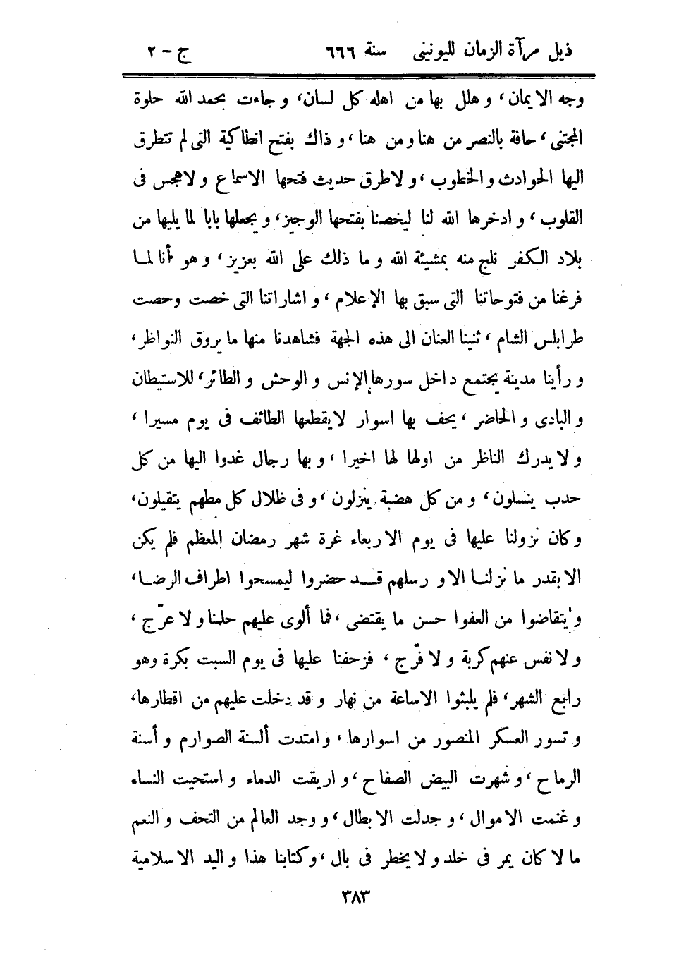 وجه الإيمان، وهلل بها من أهله كل لسان، وجاءت بحمد الله حلوة المجتنى، حافة بالنصر من هنا ومن هنا، وذاك بفتح إنطاكية التي لم تتطرق إليها الحوادث والخطوب، ولا طرق حديث فتحها إلا سماع ولا هجس في القلوب، وادخرها الله لنا ليخصنا بفتحها الوجيز، ويجعلها باباً لما يليها من بلاد الكفر نلج منه بمشيئة الله وما ذلك على الله بعزيز، وهو أنا لما فرغنا من فتوحاتنا التي سبق بها الإعلام، وإشاراتنا التي خصت وحصت طرابلس الشام، ثنينا العنان إلى هذه الجهة فشاهدنا منها ما يروق النواظر، ورأينا مدينة يجتمع داخل سورها الإنس والوحش والطائر، للاستيطان والبادي والحاضر، يحف بها أسوار لا يقطعها الطائف في يوم مسيراً، ولا يدرك الناظر من أولها لها أخيراً، وبها رجال غدوا إليها من كل حدب ينسلون، ومن كل هضبة ينزلون، وفي ظلال كل مطهم يتقيلون، وكان نزولنا عليها في يوم الأربعاء غرة شهر رمضان المعظم فلم يكن إلا بقدر ما نزلنا إلا ورسلهم قد حضروا ليمسحوا أطراف الرضا، ويتقاضوا من العفوا حسن ما يقتضى، فما ألوى عليهم حلمنا ولا عرج، ولا نفس عنهم كربة ولا فرج، فزحفنا عليهم في يوم السبت بكرة وهو رابع الشهر، فلم يلبثوا إلا ساعة من نهار وقد دخلت عليهم من أقطارها، وتسور العسكر المنصور من أسوارها، وامتدت ألسنة الصوارم وأسنة الرماح، وشهرت البيض الصفاح، وأريقت الدماء واستحيت النساء وغنمت الأموال، وجدلت الأبطال، ووجد العالم من التحف والنعم ما لا كان يمر في خلد ولا يخطر في بال، وكتابنا هذا واليد الإسلامية