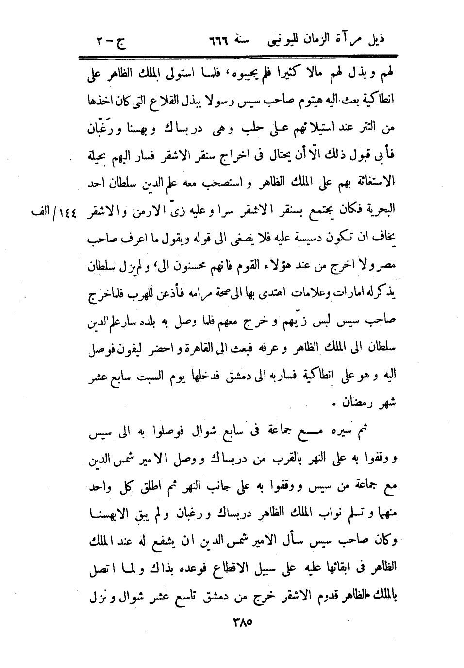 لهم وبذل لهم مالاً كثيراً فلم يجيبوه، فلما استولى الملك الظاهر على إنطاكية بعث إليه هيتوم صاحب سيس رسولاً يبذل القلاع التي كان أخذها من التتر عند استيلائهم على حلب وهي دربساك وبهسنا ورغبان فأبى قبول ذلك إلا أن يحتال في إخراج سنقر الأشقر فسار إليهم بحيلة الاستغاثة بهم على الملك الظاهر واستصحب معه علم الدين سلطان أحد البحرية فكان يجتمع بسنقر الأشقر سراً وعليه زي الأرمن والأشقر يخاف أن تكون دسيسة عليه فلا يصغي إلى قوله ويقول ما أعرف صاحب مصر ولا أخرج من عند هؤلاء القوم فإنهم محسنون إلي، ولم يزل سلطان يذكر له إمارات وعلامات اهتدي بها إلى صحة مرامه فأذعن للهرب فلما خرج صاحب سيس لبس زيهم وخرج معهم فلما وصل به بلده سار علم الدين سلطان إلى الملك الظاهر وعرفه فبعث إلى القاهرة وأحضر ليفون فوصل إليه وهو على إنطاكية فسار به إلى دمشق فدخلها يوم السبت سابع عشر شهر رمضان.