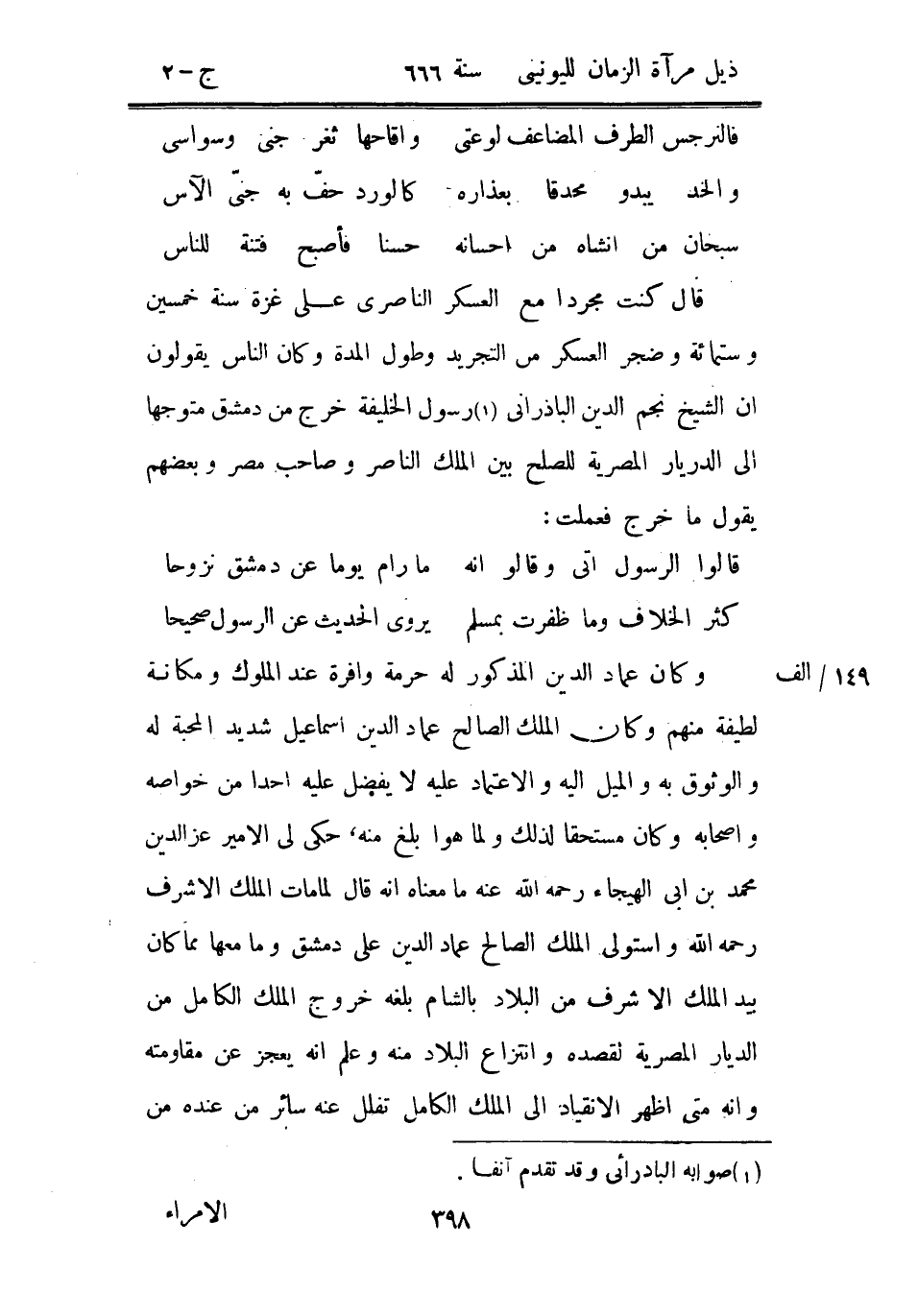 قال كنت مجرداً مع العسكر الناصري على غزة سنة خمسين وستمائة وضجر العسكر من التجريد وطول المدة وكان الناس يقولون إن الشيخ نجم الدين الباذراني رسول الخليفة خرج من دمشق متوجهاً إلى الديار المصرية للصلح بين الملك الناصر وصاحب مصر وبعضهم يقول ما خرج فعملت: