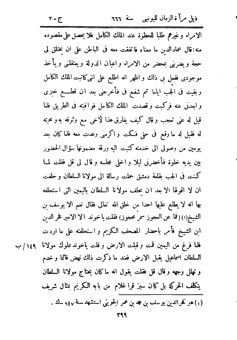 الأمراء وغيرهم طلباً للحظوة عند الملك الكامل فلا يحصل على مقصوده منه: قال عماد الدين ما معناه فاتفقت معه في الباطن على أن يختلق لي حجة ويضربني بمحضر من الأمراء وأعيان الدولة ويعتقلني ويأخذ موجودي ففعل بي ذلك وأظهر أنه اطلع على أنني كاتبت الملك الكامل وبقيت في الجب أياماً ثم شفع في فأخرجني بعد أن قطع خبزي وأبعدني عنه فركبت وقصدت الملك الكامل فوافيته في الطريق فلما قيل له عني تعجب وقال كيف يفارق هذا لأخي مع وثوقه به ومحبته له فقيل له ما وقع في حقي فسكت وأكرمني وعدت معه فلما كان بعد يومين من وصولي إلى خدمته كتبت إليه ورقة مضمونها سؤال الحضور بين يديه خلوة فأحضرني ليلاً وأخلى مجلسه وقال لي قل فقلت لما كنت في الجب بقلعة دمشق حملت رسالة إلى مولانا السلطان وحلفت أن لا أقولها إلا بعد أن يحلف مولانا السلطان باليمين التي استحلفه بها أنه لا يطلع عليها أحداً من خلق الله تعالى فقال نعم إلا يوسف بن الشيخ " فما عن العجوز سمر محجوز " فقلت يا خوند إلا الأمير فخر الدين ابن الشيخ فأمر بإحضار المصحف الكريم واستحلفته على ما أردت فلما فرغ من اليمين قمت وقبلت الأرض وقلت يا خوند مملوك مولانا السلطان إسماعيل يقبل الأرض فعند ما ذكرت ذلك نهض قائماً وخدم وتهلل وجهه وقال قل فقلت يقول أنه ما كان يحتاج مولانا السلطان بتكلف الحركة بل كان سيزقرا غلام من بابه الكريم بمثال شريف