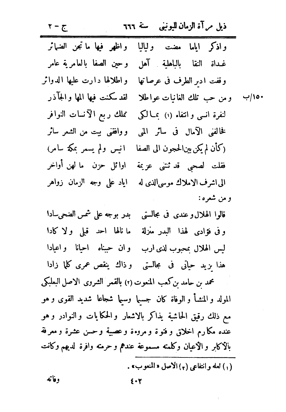 محمد بن حامد بن كعب المنعوت بالقمر الشروي الأصل البعلبكي المولد والمنشأ والوفاة كان جسيماً وسيماً شجاعاً شديد القوى وهو مع ذلك رقيق الحاشية يذاكر بالأشعار والحكايات والنوادر وهو عنده مكارم أخلاق وفتوة ومروءة وعصبية وحسن عشرة ومعفرة بالأكابر والأعيان وكلمته مسموعة عندهم وحرمته وافرة ليدهم وكانت