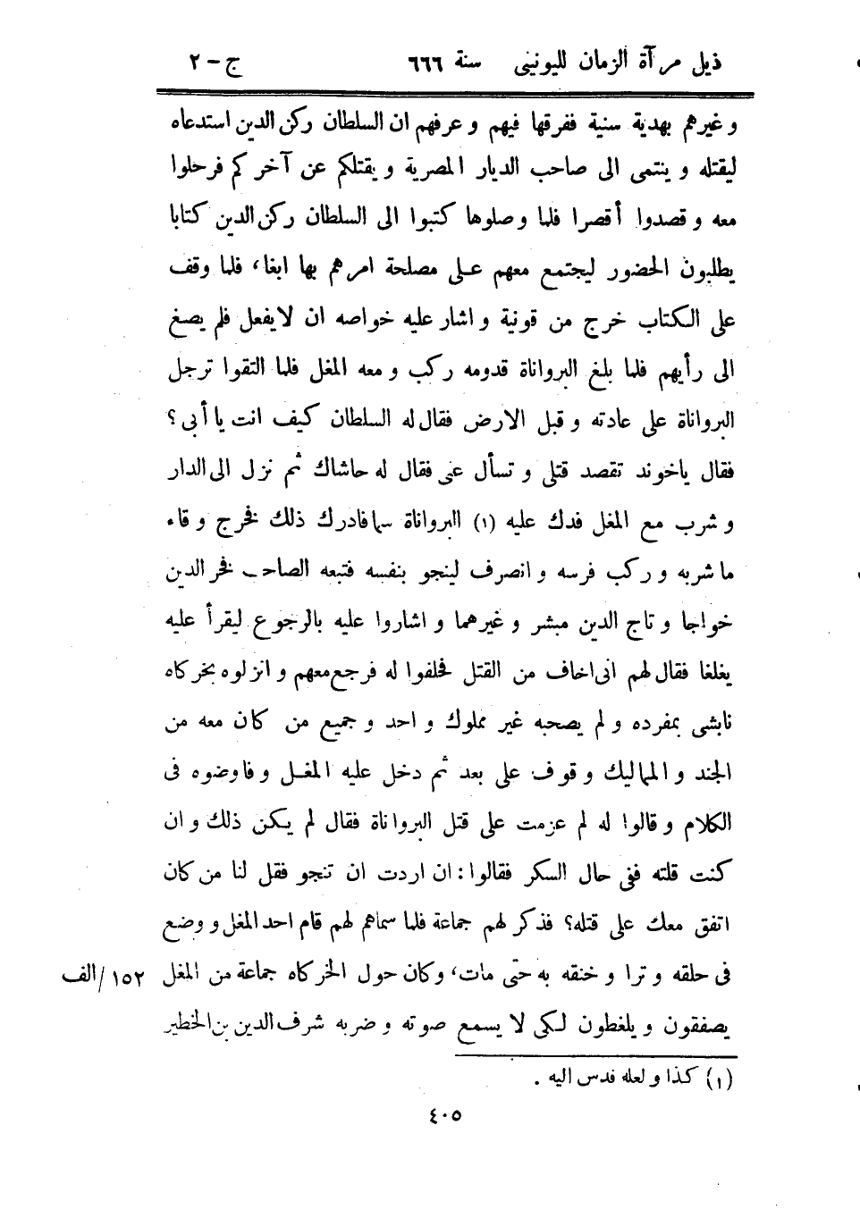 وغيرهم بهدية سنية ففرقها فيهم وعرفهم أن السلطان ركن الدين استدعاه ليقتله وينتمي إلى صاحب الديار المصرية ويقتلكم عن آخركم فرحلوا معه وقصدوا أقصراً فلما وصلوها كتبوا إلى السلطان ركن الدين كتاباً يطلبون الحضور ليجتمع معهم على مصلحة أمرهم بها أبغا، فلما وقف على الكتاب خرج من قونية وأشار عليه خواصه أن لا يفعل فلم يصغ إلى رأيهم فلما بلغ البرواناة قدومه ركب ومعه المغل فلما التقوا ترجل البرواناة على عادته وقبل الأرض فقال له السلطان كيف أنت يا أبي؟ فقال يا خوند تقصد قتلي وتسأل عني فقال له حاشاك ثم نزل إلى الدار وشرب مع المغل فدك عليه البرواناة سما فأدرك ذلك فخرج وقاء ما شربه وركب فرسه وانصرف لينجو بنفسه فتبعه الصاحب فخر الدين خواجا وتاج الدين مبشر وغيرهما وأشاروا عليه بالرجوع ليقرأ عليه يغلغا فقال لهم إني أخاف من القتل فحلفوا له فرجع معهم وأنزلوه بخركاه نابشي بمفرده ولم يصحبه غير مملوك واحد وجميع من كان معه من الجند والمماليك وقوف على بعد ثم دخل عليه المغل وفاوضوه في الكلام وقالوا له لم عزمت على قتل البرواناة فقال لم يكن ذلك وإن كنت قلته ففي حال السكر فقالوا: إن أردت أن تنجو فقل لنا من كان اتفق معك على قتله؟ فذكر لهم جماعة فلما سماهم لهم قام أحد المغل ووضع في حلقه وتراً وخنقه به حتى مات، وكان حول الخركاه جماعة من المغل يصفقون ويلغطون لكي لا يسمع صوته وضربه شرف الدين بن الخطير