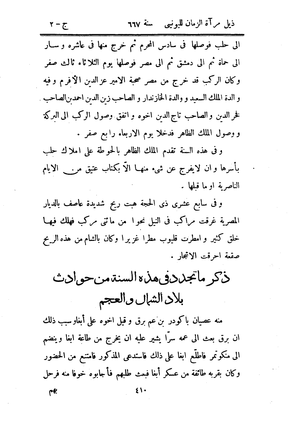 إلى حلب فوصلها في سادس المحرم ثم خرج منها في عاشره وسار إلى حماة ثم إلى دمشق ثم إلى مصر فوصلها يوم الثلاثاء ثالث صفر وكان الركب قد خرج من مصر صحبة الأمير عز الدين الأفرم وفيه والدة الملك السعيد ووالدة الخازندار والصاحب زين الدين أحمد بن الصاحب فخر الدين والصاحب تاج الدين أخوه واتفق وصول الركب إلى البركة ووصول الملك الظاهر فدخلا يوم الأربعاء رابع صفر.