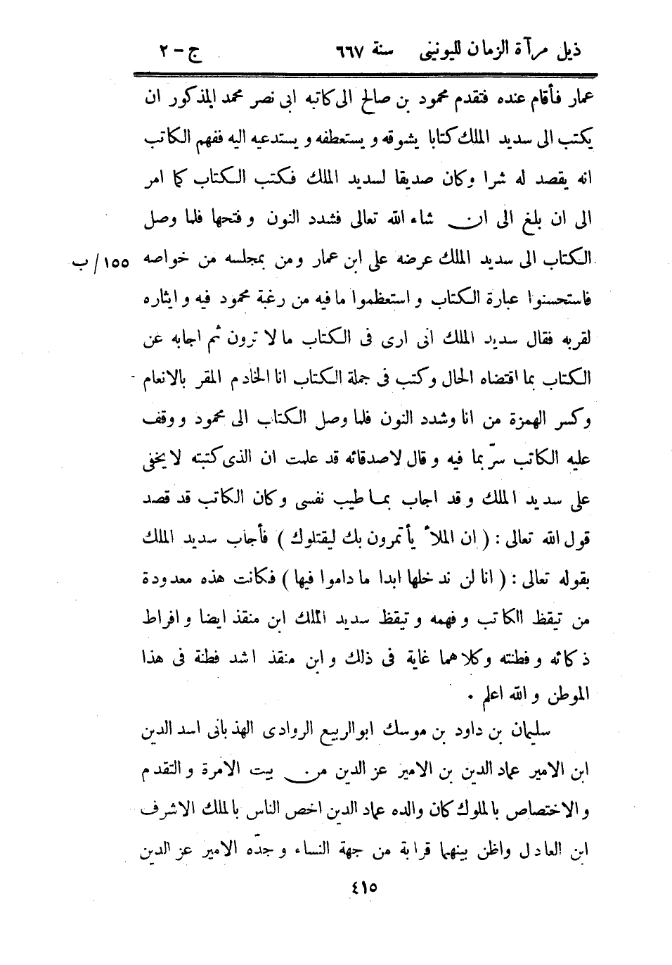 عمار فأقام عنده فتقدم محمود بن صالح إلى كاتبه أبي نصر محمد المذكور أن يكتب إلى سديد الملك كتاباً يشوقه ويستعطفه ويستدعيه إليه ففهم الكاتب أنه يقصد له شراً وكان صديقاً لسديد الملك فكتب الكتاب كما أمر إلى أن بلغ إلى أن شاء الله تعالى فشدد النون وفتحها فلما وصل الكتاب إلى سديد الملك عرضه على ابن عمار ومن بمجلسه من خواصه فاستحسنوا عبارة الكتاب واستعظموا ما فيه من رغبة محمود فيه وإيثاره لقربه فقال سديد الملك إني أرى في الكتاب ما لا ترون ثم أجابه عن الكتاب بما اقتضاه الحال وكتب في جملة الكتاب أنا الخادم المقر بالأنعام وكسر الهمزة من أنا وشدد النون فلما وصل الكتاب إلى محمود ووقف عليه الكاتب سر بما في هذا وقال لأصدقائه قد علمت أن الذي كتبته لا يخفى على سديد الملك وقد أجاب بما طيب نفسي وكان الكاتب قد قصد قول الله تعالى: " إن الملأ يأتمرون بك ليقتلوك " فأجاب سديد الملك بقوله تعالى: " إنا لن ندخلها أبداً ما داموا فيها " فكانت هذه معدودة من تيقظ الكاتب وفهمه تيقظ سديد الملك ابن منقذ أيضاً وإفراط ذكائه وفطنته وكلاهما غاية في ذلك وابن منقذ أشد فطنة في هذا الموطن والله أعلم.