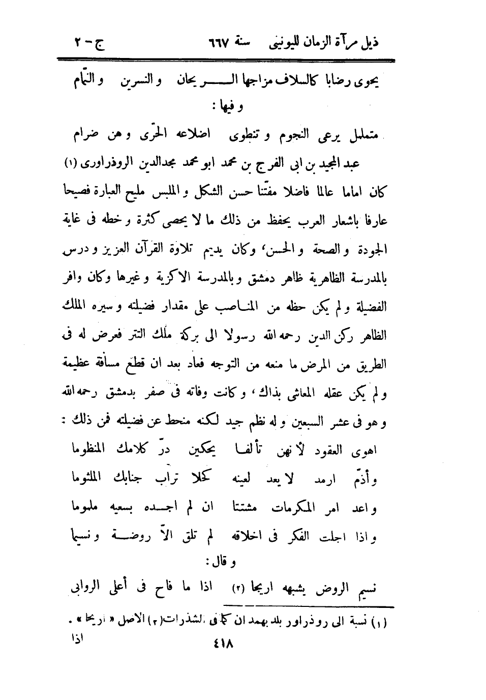 عبد المجيد بن أبي الفرج بن محمد أبو محمد مجد الدين الروذراوري كان إماماً عالماً فاضلاً مفتناً حسن الشكل والملبس مليح العبارة فصيحاً عارفاً بأشعار العرب يحفظ من ذلك ما لا يحصى كثرة وخطه في غاية الجودة والصحة والحسن، وكان يديم تلاوة القرآن العزيز ودرس بالمدرسة الظاهرية ظاهر دمشق وبالمدرسة الأكزية وغيرها وكان وافر الفضيلة ولم يكن حظه من المناصب على مقدار فضيلته وسيره الملك الظاهر ركن الدين رحمه الله رسولاً إلى بركة ملك التتر فعرض له في الطريق من المرض ما منعه من التوجه فعاد بعد أن قطع مسافة عظيمة ولم يكن عقله المعاشي بذاك، وكانت وفاته في صفر بدمشق رحمه الله وهو في عشر السبعين وله نظم جيد لكنه منحط عن فضيلته فمن ذلك: