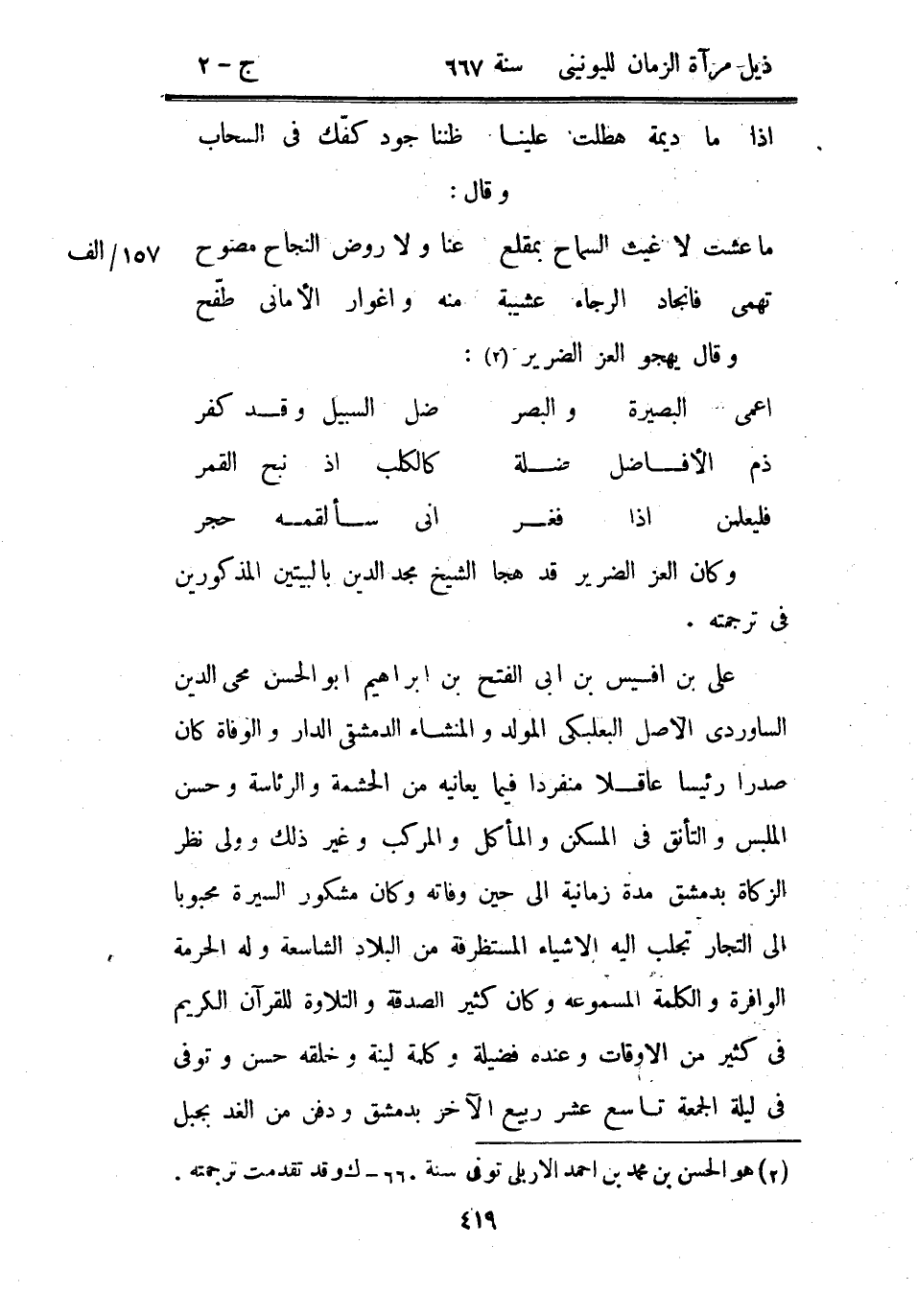 وكان العز الضرير قد هجا الشيخ مجد الدين بالبيتين المذكورين في ترجمته.
