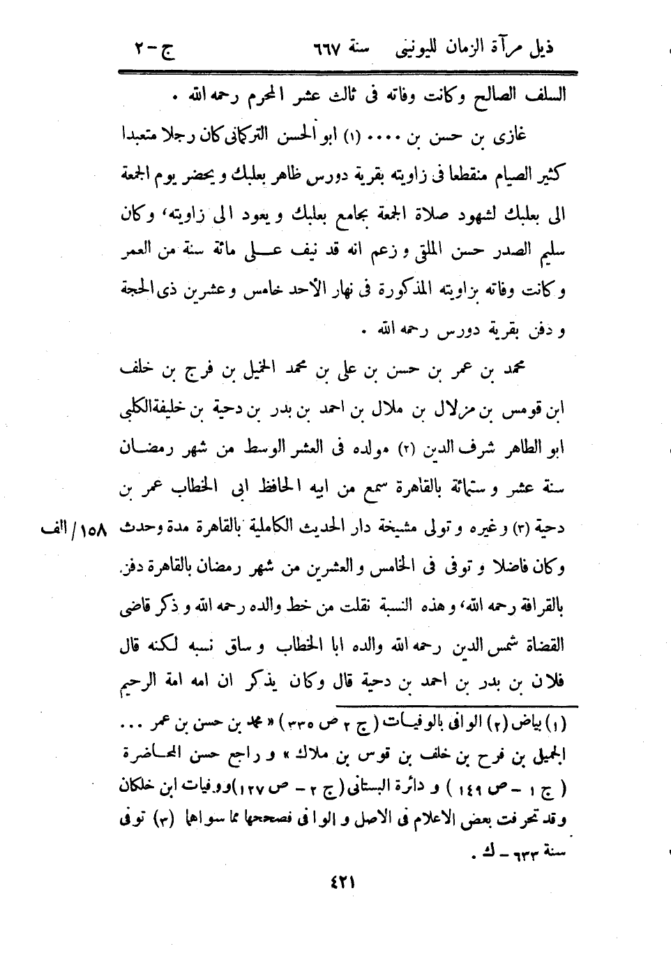 غازي بن حسن بن.... أبو الحسن التركماني كان رجلاً متعبداً كثير الصيام منقطعاً في زاويته بقرية دورس ظاهر بعلبك ويحضر يوم الجمعة إلى بعلبك لشهود صلاة الجمعة بجامع بعلبك ويعود إلى زاويته، وكان سليم الصدر حسن الملقى وزعم أنه قد نيف على مائة سنة من العمر وكانت وفاته بزاويته المذكورة في نهار الأحد خامس وعشرين ذي الحجة ودفن بقرية دورس رحمه الله.