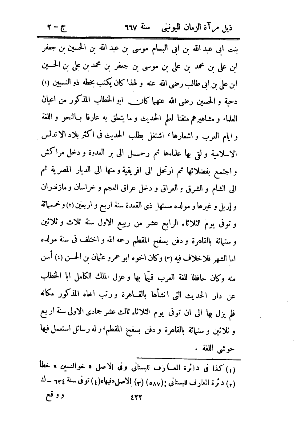 بنت أبي عبد الله بن أبي البسام موسى بن عبد الله بن الحسين بن جعفر ابن علي بن محمد بن علي بن موسى بن جعفر بن محمد بن علي بن الحسين ابن علي بن أبي طالب رضي الله عنه ولهذا كان يكتب بخطه ذو النسبين دحية والحسين رضي الله عنهما كان أبو الخطاب المذكور من أعيان العلماء ومشاهيرهم متقناً لعلم الحديث وما يتعلق به عارفاً النحو واللغة وأيام العرب وأشعارها، اشتغل بطلب الحديث في أكثر بلاد الأندلس الإسلامية ولقي بها علماءها ثم رحل إلى بر العدوة ودخل مراكش واجتمع بفضلائها ثم ارتحل إلى إفريقية ومنها إلى الديار المصرية ثم إلى الشام والشرق والعراق ودخل عراق العجم وخراسان ومازندران وإربل وغيرها ومولده مستها ذي القعدة سنة أربع وأربعين وخمسمائة وتوفي يوم الثلاثاء الرابع عشر من ربيع الأول سنة ثلاث وثلاثين وستمائة بالقاهرة ودفن بسفح المقطم رحمه الله واختلف في سنة مولده أما الشهر فلا خلاف فيه وكان أخوه أبو عمرو عثمان بن الحسن أسن منه وكان حافظاً للغة العرب قيماً بها وعزل الملك الكامل أبا الخطاب عن دار الحديث التي أنشأها بالقاهرة ورتب أخاه المذكور مكانه فلم يزل بها إلى أن توفي يوم الثلاثاء ثالث عشر جمادى الأولى سنة أربع وثلاثين وستمائة بالقاهرة ودفن بسفح المقطم، وله رسائل استعمل فيها حوشي اللغة.