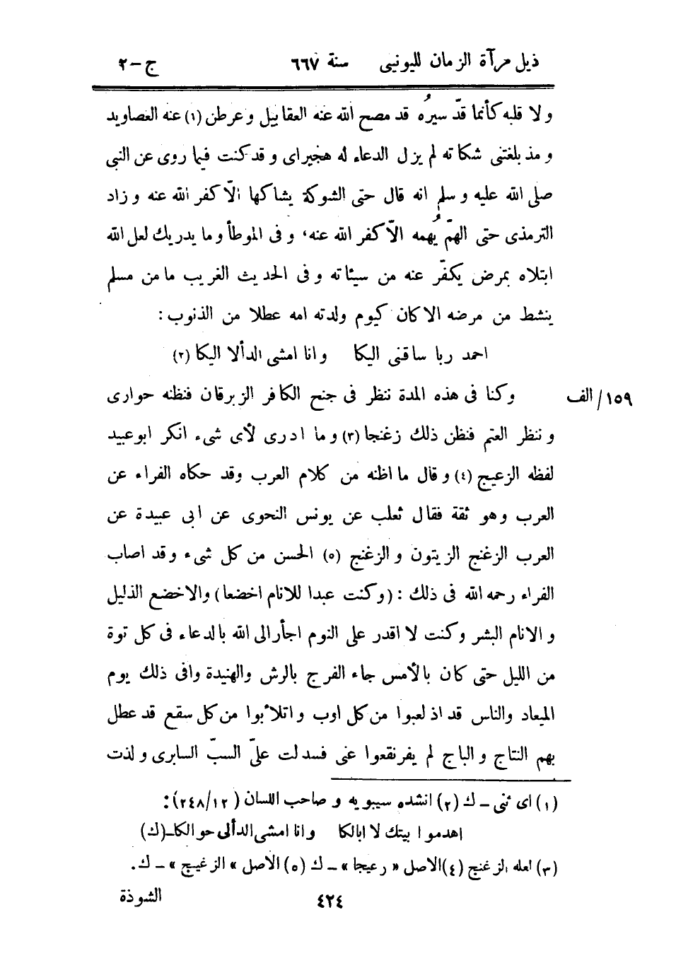 وكنا في هذه المدة ننظر في جنح الكافر الزبرقان فنظنه حواري وننظر العتم فنظن ذلك زغنجا وما أدري لأي شيء أنكر أبو عبيد لفظه الزعيج وقال ما أظنه من كلام العرب وقد حكاه الفراء عن العرب وهو ثقة فقال ثعلب عن يونس النحوي عن أبي عبيدة عن العرب الزغنج الزيتون والزغنج الحسن من كل شيء وقد أصاب الفراء رحمه الله في ذلك: وكنت عبداً للأنام أخضعا والأخضع الذليل، والأنام البشر وكنت لا أقدر على النوم أجأر إلى الله بالدعاء في كل توة من الليل حتى كان بالأمس جاء الفرج بالرش والهنيدة وافى ذلك يوم الميعاد والناس قد إذ لعبوا من كل أوب وإتلأبوا من كل سقع قد عطل بهم النتاج والباج لم يفرنقعوا عني فسدلت علي السب السابري ولذت