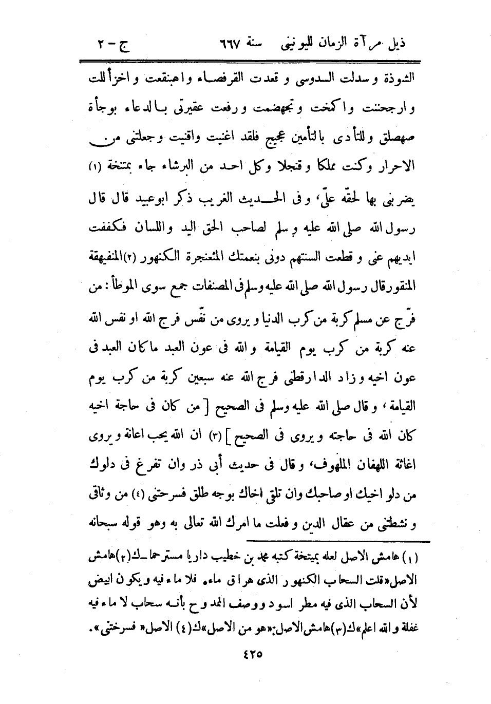 الشوذة وسدلت السدوسي وقعدت القرفصاء وأهبنقعت وأخزأللت وارجحننت وأكمخت وتجهضمت ورفعت عقيرتي بالدعاء بوجأة صهصلق وللتأدي بالتأمين عجيج فللقد أغنيت وأقنيت وجعلتني من الأحرار وكنت مملكاً وقنجلاً وكل أحد من البرشاء جاء بمتنخة يضربني بها لحقه علي، وفي الحديث الغريب ذكر أبو عبيد قال قال رسول الله صلى الله عليه وسلم لصاحب الحق اليد واللسان فكففت أيديهم عني وقطعت ألسنتهم دوني بنعمتك المثعنجرة الكنهور المنفيهقة المنقور قال رسول الله صلى الله عليه وسلم في المصنفات جمع سوى الموطأ: من فرج عن مسلم كربة من كرب الدنيا ويروى من نفس فرج الله أو نفس الله عنه كربة من كرب يوم القيامة والله في عون العبد ما كان العبد في عون أخيه وزاد الدارقطني فرج الله عنه سبعين كربة من كرب يوم القيامة، وقال صلى الله عليه وسلم في الصحيح " من كان في حاجة أخيه كان الله في حاجته " ويروى في الصحيح إن الله يحب إعانة ويروى إغاثة اللهفان الملهوف، وقال في حديث أبي ذر وإن تفرغ في دلوك من دلو أخيك أو صاحبك وأن تلقي أخاك بوجه طلق فسرحتني من وثاقي ونشطتني من عقال الدين وفعلت ما أمرك الله تعالى به وهو قوله سبحانه