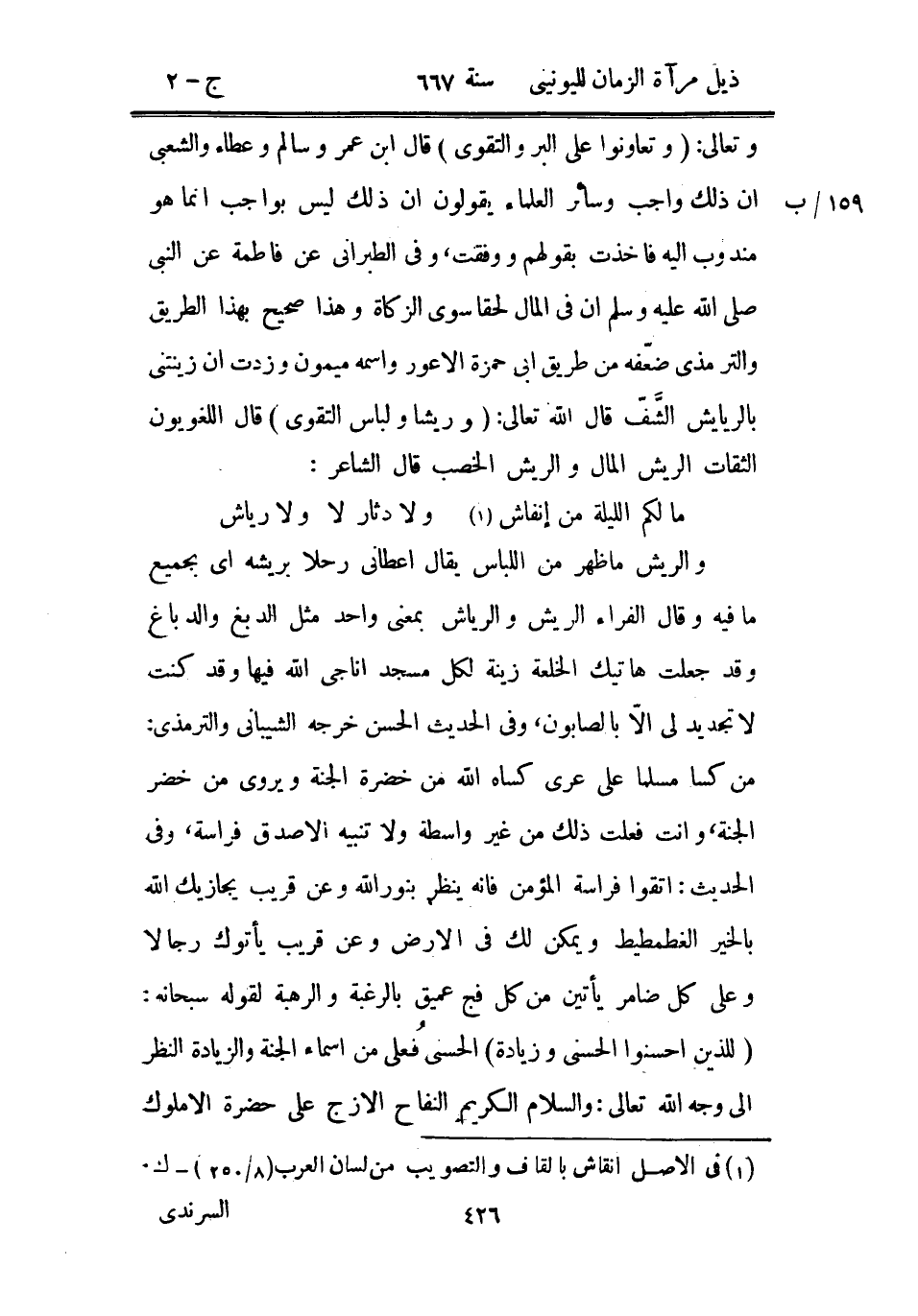 والريش ما ظهر من اللباس يقال أعطاني رحلاً بريشه أي بجميع ما فيه وقال الفراء الريش والرياش بمعنى واحد مثل الدبغ والدباغ وقد جعلت هاتيك الخلعة زينة لكل مسجد أناجي الله فيها وقد كنت لا تجديد لي إلا بالصابون، وفي الحديث الحسن خرجه الشيباني والترمذي من كسا مسلماً على عرى كساه الله من خضرة الجنة ويروى من خضر الجنة، وأنت فعلت ذلك من غير واسطة ولا تنبيه إلا صدق فراسة، وفي الحديث: اتقوا فراسة المؤمن فإنه ينظر بنور الله وعن قريب يجازيك الله بالخير الغطمطيط ويمكن لك في الأرض وعن قريب يأتوك رجالاً وعلى كل ضامر يأتين من كل فج عميق بالرغبة والرهبة لقوله سبحانه: " للذين أحسنوا الحسنى وزيادة " الحسنى فعلن من أسماء الجنة والزيادة النظر إلى وجه الله تعالى: والسلام الكريم النفاح الأزج على حضرة الأملوك