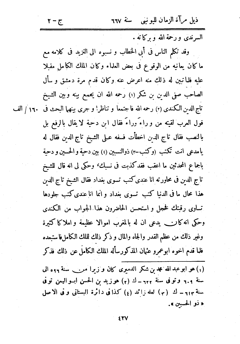 وقد تكلم الناس في أبي الخطاب ونسبوه إلى التزيد في كلامه مع ما كان يعانيه من الوقوع في بعض العلماء وكان الملك الكامل مقبلاً عليه فلما تبين له ذلك منه أعرض عنه وكان قدم مرة دمشق وسأل الصاحب صفي الدين بن شكر رحمه الله أن يجمع بينه وبين الشيخ تاج الدين الكندي رحمه الله فاجتمعا وتناظرا وجرى بينهما البحث في قول العرب لقيته من وراءَ وراءَ فقال ابن دحية لا يقال بالرفع بل بالنصب فقال تاج الدين أخطأت فسفه على الشيخ تاج الدين فقال له يا مدعي أنت تكتب وكتب ذو النسبين بين دحية والحسين ودحية بإجماع المحدثين ما أعقب فقد كذبت في نسبك، وحكى لي أنه قال للشيخ تاج الدين في محاورته أنا عندي كتب تسوي بغداد فقال الشيخ تاج الدين هذا محال ما في الدنيا كتب تسوي بغداد وإنما أنا عندي كتب جلودها تساوي رقبتك فخجل واستحسن الحاضرون هذا الجواب من الكندي وحكى أنه كان يدعي أن له بالمغرب أموالاً عظيمة وأملاكاً كثيرة وغير ذلك من عظم القدر والجاه والمال وذكر ذلك للملك الكامل فاستبعده فلما قدم أخوه أبو عمرو عثمان المذكور سأله الملك الكامل عن ذلك فذكر