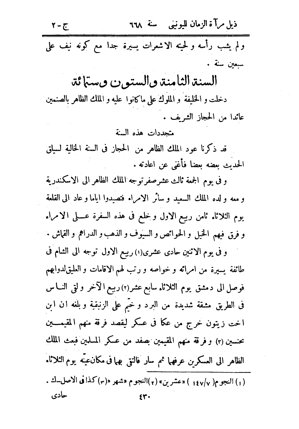 دخلت والخليفة والملوك على ما كانوا عليه والملك الظاهر بالصنمين عائداً من الحجاز الشريف.