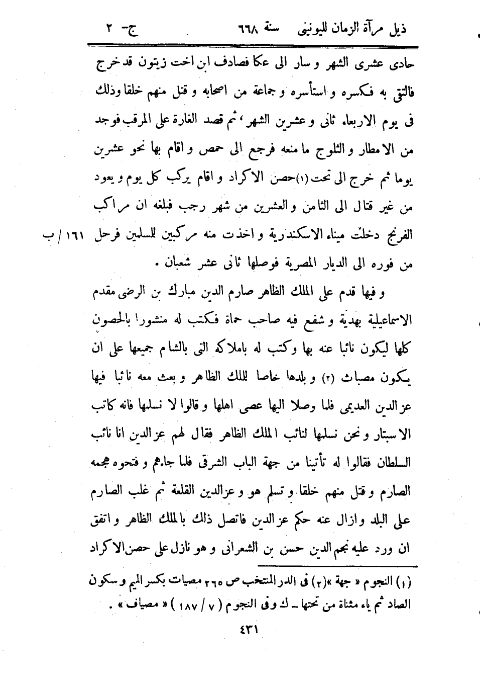 وفيها قدم على الملك الظاهر صارم الدين مبارك بن الرضى مقدم الإسماعيلية بهدية وشفع فيه صاحب حماة فكتب له منشوراً بالحصون كلها ليكون نائباً عنه بها وكتب له بأملاكه التي بالشام جميعها على أن يكون مصباث وبلدها خاصاً للملك الظاهر وبعث معه نائباً فيها عز الدين العديمي فلما وصلا إليها عصى أهلها وقالوا لا نسلمها فإنه كاتب الاسبتار ونحن نسلمها لنائب الملك الظاهر فقال لهم عز الدين أنا نائب السلطان فقالوا له تأتينا من جهة الباب الشرقي فيما جاءهم وفتحوه هجمه الصارم وقتل منهم خلقاً وتسلم هو وعز الدين القلعة ثم غلب الصارم على البلد وأزال عنه حكم عز الدين فاتصل ذلك بالملك الظاهر واتفق إن ورد عليه نجم الدين حسن بن الشعراني وهو نازل على حصن الأكراد