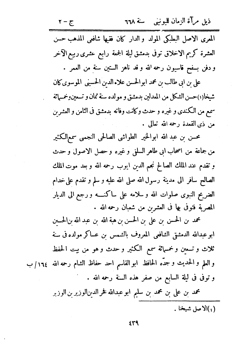 المعري الأصل البعلبكي المولد والدار كان فقيهاً شافعي المذهب حسن العشرة كريم الأخلاق توفي بدمشق ليلة الجمعة رابع عشري ربيع الآخر ودفن بسفح قاسيون رحمه الله وقد ناهز الستين سنة من العمر.