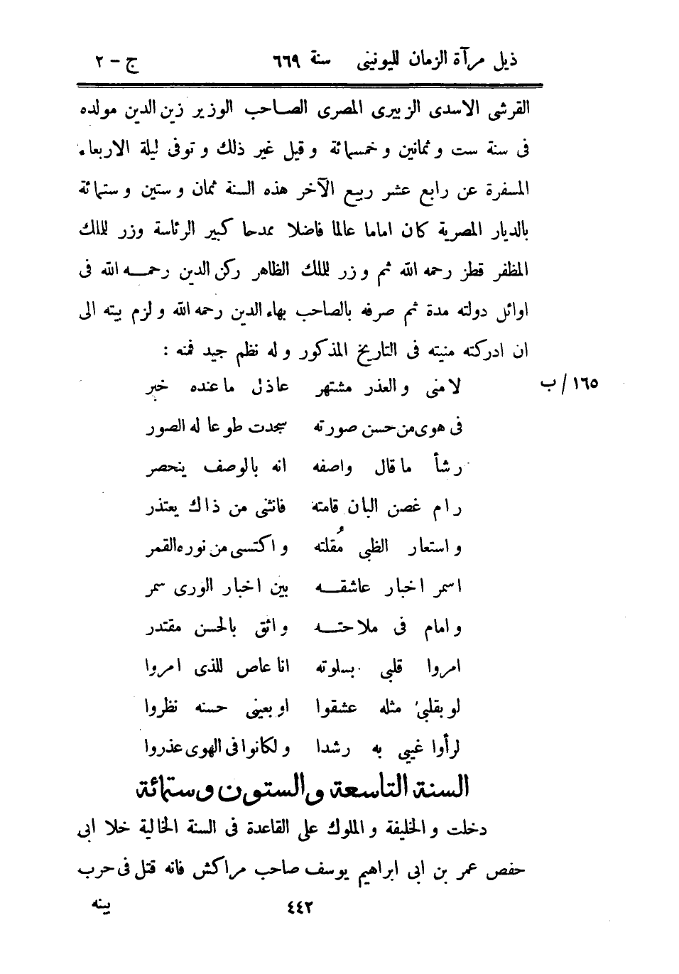 القرشي الأسدي الزبيري المصري الصاحب الوزير زين الدين مولده في سنة ست وثمانين وخمسمائة وقيل غير ذلك وتوفي ليلة الأربعاء المسفرة عن رابع عشر ربيع الآخر هذه السنة ثمان وستين وستمائة بالديار المصرية كان إماماً عالماً فاضلاً ممدحاً كبير الرئاسة وزر للملك المظفر قطز رحمه الله ثم وزر للملك الظاهر ركن الدين رحمه الله في أوائل دولته مدة ثم صرفه بالصاحب بهاء الدين رحمه الله ولزم بيته إلى أن أدركته منيته في التاريخ المذكور وله نظم جيد فمنه: