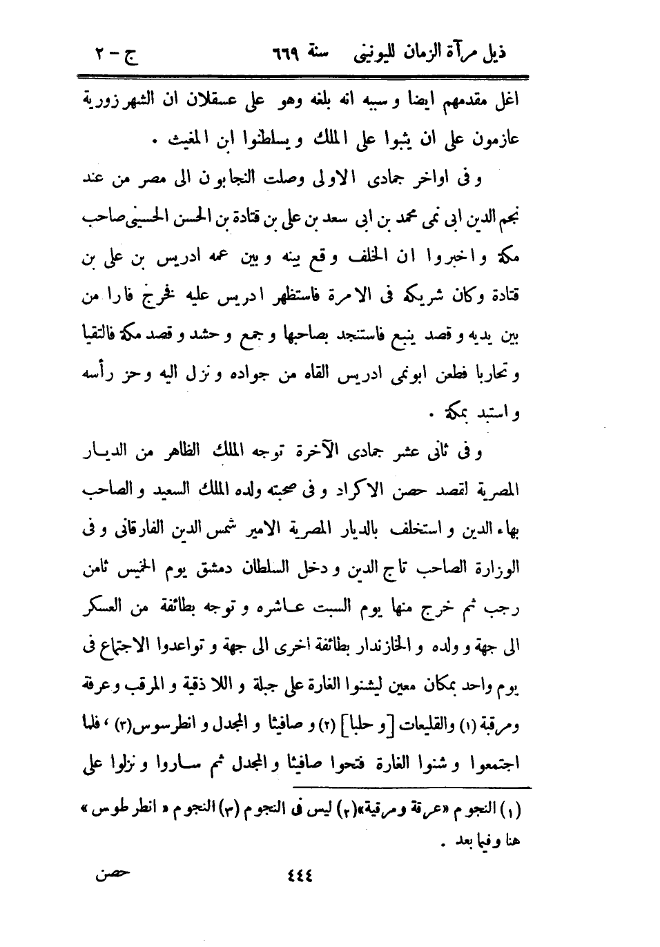 وفي أواخر جمادى الأولى وصلت النجابون إلى مصر من عند نجم الدين ابن نمي محمد بن أبي سعد بن علي بن قتادة بن الحسن الحسيني صاحب مكة وأخبروا أن الخلف وقع بينه وبين عمه إدريس بن علي بن قتادة وكان شريكه في الأمرة فاستظهر إدريس عليه فخرج فاراً من بين يديه وقصد ينبع فاستنجد بصاحبها وجمع وحشد وقصد مكة فالتقيا وتحاربا فطعن أبو نمى إدريس ألقاه من جواده ونزل إليه وحز رأسه واستبد بمكة.