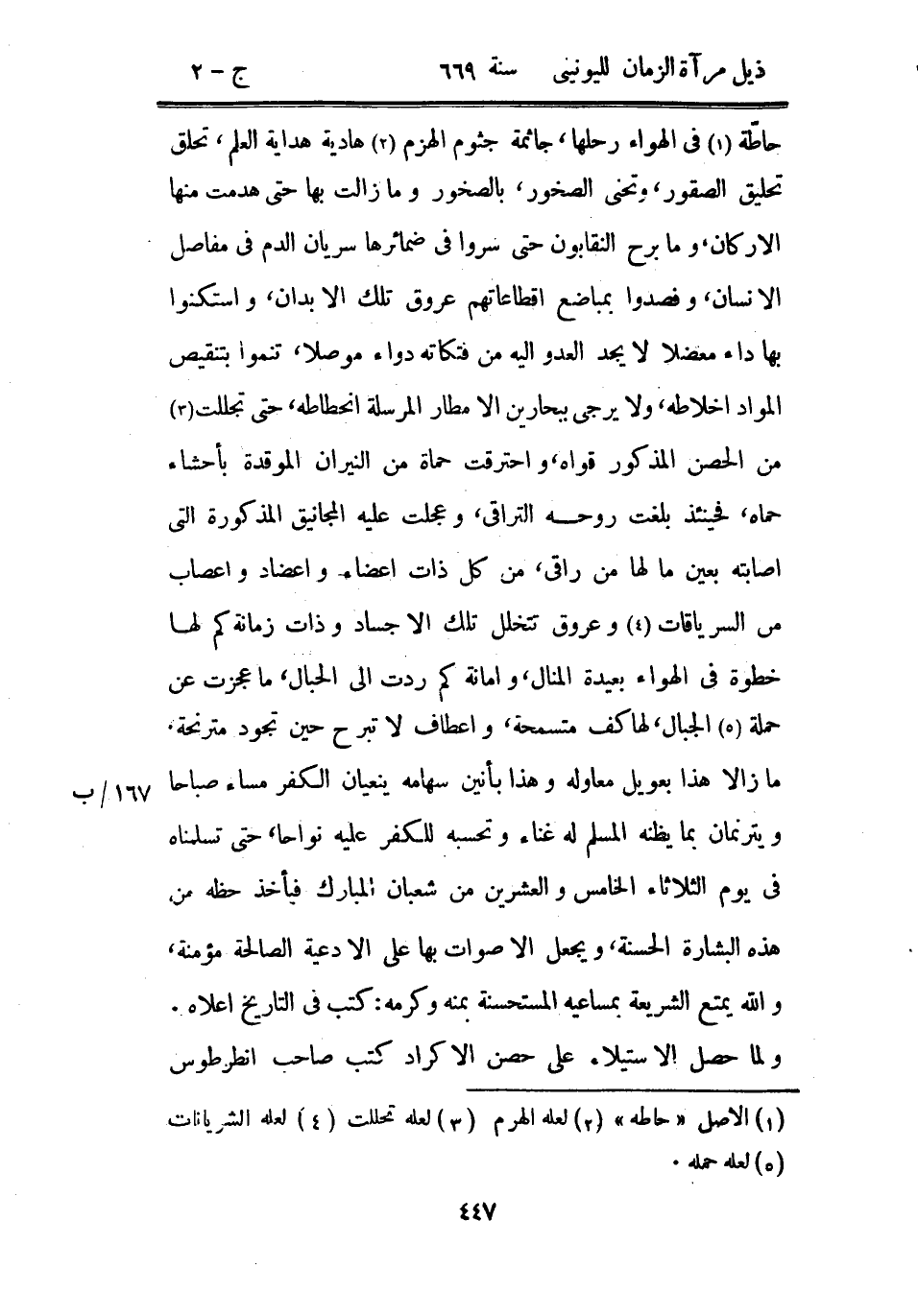 حاطة في الهواء رحلها، جائمة جثوم الهزم هادية هداية العلم، تحلق تحليق الصقور، وتحني الصخور، بالصخور وما زالت بها حتى هدمت منها الأركان، وما برح النقابون حتى سروا في ضمائرها سريان الدم في مفاصل الإنسان، وقصدوا بمباضع إقطاعاتهم عروق تلك الأبدان، واستكنوا بها داء معضلاً لا يجد العدو إليه من فتكاته دواء موصلاً، تنموا بتنقيص المواد أخلاطه، ولا يرجى ببحارين الأمطار المرسلة انحطاطه، حتى تجللت من الحصن المذكور قواه، واحترقت حماة من النيران الموقدة بأحشاء حماه، فحينئذ بلغت روحه التراقي، وعجلت عليه المجانيق المذكورة التي أصابته بعين ما لها من راقي، من كل ذات أعضاء وأعضاد وأعصاب من السرياقات وعروق تتخلل تلك الأجساد وذات زمانة كم لها خطوة في الهواء بعيدة المنال، وأمانة كم ردت إلى الحبال، ما عجزت عن حمله الجبال، لها كف متسمحة، وأعطاف لا تبرح حين تجود مترنحة. ما زالا هذا بعويل معاوله وهذا بأنين سهامه ينعيان الكفر مساء صباحاً ويترنمان بما يظنه المسلم له غناء وتحسبه للكفر عليه نواحاً، حتى تسلمناه في يوم الثلاثاء الخامس والعشرين من شعبان المبارك فيأخذ حظه من هذه البشارة الحسنة، ويجعل الأصوات بها على الأدعية الصالحة مؤمنة، والله يمتع الشريعة بمساعيه المستحسنة بمنه وكرمه: كتب في التاريخ أعلاه، ولما حصل الاستيلاء على حصن الأكراد كتب صاحب أنطرطوس