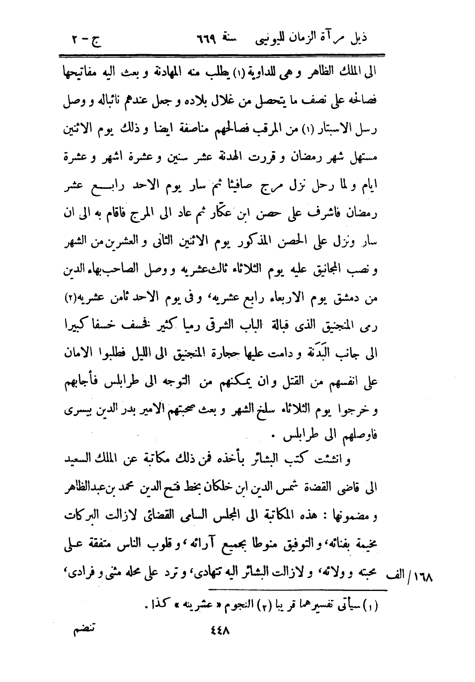 إلى الملك الظاهر وهي للداوية يطلب منه المهادنة وبعث إليه مفاتيحها فصالحه على نصف ما يتحصل من غلال بلاده وجعل عندهم نائباً له ووصل رسل الاستبار من المرقب فصالحهم مناصفة أيضاً وذلك يوم الاثنين مستهل شهر رمضان وقررت الهدنة عشر سنين وعشرة أشهر وعشرة أيام ولما رحل نزل مرج صافيثا ثم سار يوم الأحد رابع عشر رمضان فأشرف على حصن بن عكار ثم عاد إلى المرج فأقام به إلى أن سار ونزل على الحصن المذكور يوم الاثنين الثاني والعشرين من الشهر ونصب المجانيق عليه يوم الثلاثاء ثالث عشريه ووصل الصاحب بهاء الدين من دمشق يوم الأربعاء رابع عشريه، وفي يوم الأحد ثامن عشريه رمى المنجنيق الذي قبالة الباب الشرقي رمياً كثير فخسف خسفاً كبيراً إلى جانب البدنة ودامت عليها حجارة المنجنيق إلى الليل فطلبوا