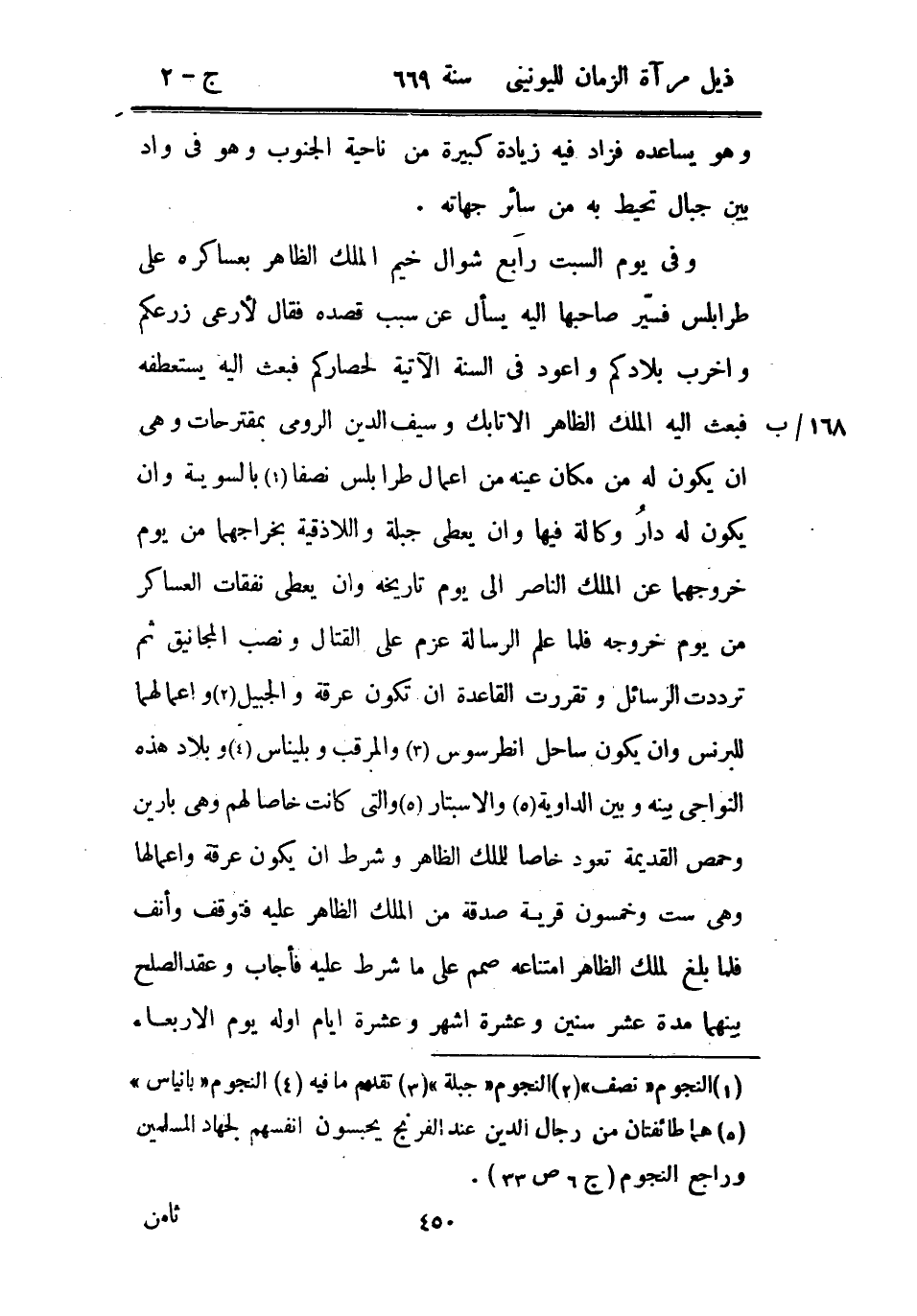وفي يوم السبت رابع شوال خيم الملك الظاهر بعساكره على طرابلس فسير صاحبها إليه يسأل عن سبب قصده فقال لأرعى زرعكم وأخرب بلادكم وأعود في السنة الآتية لحصاركم فبعث إليه يتسعطفه فبعث إليه الملك الظاهر الأتابك وسيف الدين الرومي بمقترحات وهي أن يكون له من مكان عينه من أعمال طرابلس نصفاً بالسوية وأن يكون له دار وكالة فيها وأن يعطي جبلة واللاذقية بخراجهما من يوم خروجهما عن الملك الناصر إلى يوم تاريخه وأن يعطي نفقات العساكر من يوم خروجه فلما علم الرسالة عزم على القتال ونصب المجانيق ثم ترددت الرسائل وتقررت القاعدة أن تكون عرقة والجبيل وأعمالهما للبرنس وأن يكون ساحل أنطرسوس والمرقب وبليناس وبلاد هذه النواحي بينه وبين الدواية والاسبتار والتي كانت خاصاً لهم وهي بارين وحمص القديمة تعود خاصاً للملك الظاهر وشرط أن يكون عرقة وأعمالها وهي ست وخمسون قرية صدقة من الملك الظاهر عليه فتوقف وأنف فلما بلغ لملك الظاهر امتناعه صمم على ما شرط عليه فأجاب وعقد الصلح بينهما مدة عشرة سنين وعشرة اشهر وعشرة أيام أوله يوم الأربعاء
