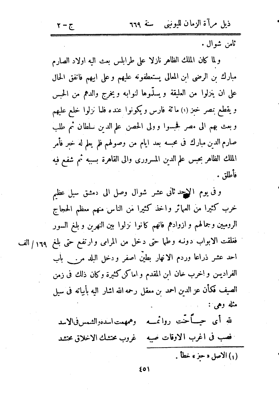وفي يوم الأحد ثاني عشر شوال وصل إلى دمشق سيل عظيم خرب كثيراً من العمائر وأخذ كثيراً من الناس منهم معظم الحجاج الروميين وجمالهم وأزوادهم فإنهم كانوا نزلوا بين النهرين وبلغ السور فغلقت الأبواب دونه وطما حتى دخل من المرامي وارتفع حتى بلغ أحد عشر ذراعاً وردم الأنهار بطين أصفر ودخل البلد من باب الفراديس وأخرب خان ابن المقدم وأماكن كثيرة وكان ذلك في زمن الصيف فكأن عز الدين أحمد بن معقل رحمه الله أشار إليه بأبياته في سيل مثله وهي: