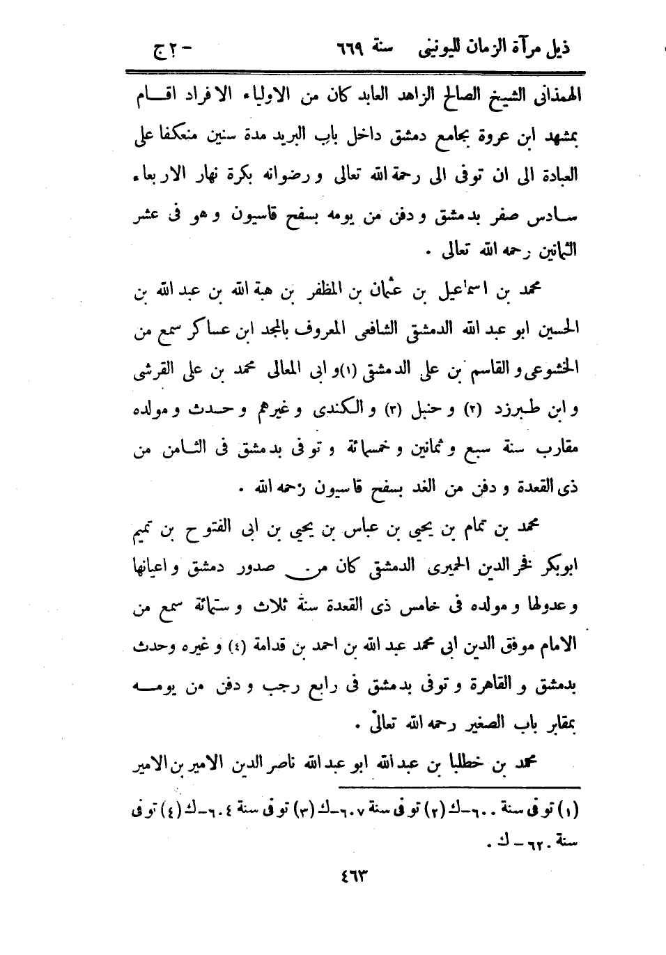 الهمذاني الشيخ الصالح الزاهد العابد كان من الأولياء الأفراد أقام بمشهد ابن عروة بجامع دمشق داخل باب البريد مدة سنين منعكفاً على العبادة إلى أن توفي إلى رحمة الله تعالى ورضوانه بكرة نهار الأربعاء سادس صفر بدمشق ودفن من يومه بسفح قاسيون وهو في عشر الثمانين رحمه الله تعالى.