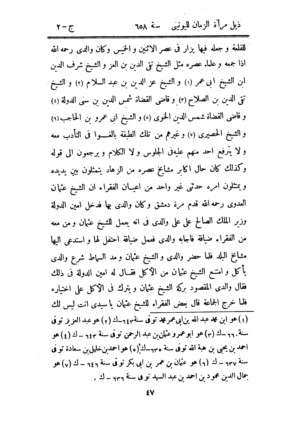 للقلعة وجعله فيها يزار في عصر الاثنين والخميس وكان والدي رحمه الله إذا جمعه وعلماء عصره مثل الشيخ تقي الدين بن العز والشيخ شرف الدين ابن الشيخ أبي عمر والشيخ عز الدين بن عبد السلام والشيخ تقي الدين بن الصلاح وقاضي القضاة شمس الدين بن سنى الدولة وقاضي القضاة شمس الدين الخوى والشيخ أبي عمرو بن الحاجب والشيخ الحصيري وغيرهم من تلك الطبقة بالغوا في التأدب معه ولا يترفع أحد منهم عليه في الجلوس ولا الكلام ويرجعون إلى قوله وكذلك كان حال أكابر مشايخ عصره من الزهاد يتمثلون بين يديه ويمتثلون أمره حدثني غير واحد من أعيان الفقراء أن الشيخ عثمان العدوي رحمه الله قدم مرة دمشق وكان والدي بها فدخل أمين الدولة وزير الملك الصالح على علي والدي في أنه يعمل للشيخ عثمان ومن معه من الفقراء ضيافة فأجابه والدي فعمل ضيافة احتفل لها واستدعى إليها مشايخ البلد فلما حضر والدي والشيخ عثمان ومد السماط شرع والدي يأكل وامتنع الشيخ عثمان من الأكل فقال له أمين الدولة في ذلك فقال والدي المقصود بركة الشيخ عثمان ويترك في الأكل على اختياره فلما خرج الجماعة قال بعض الفقراء للشيخ عثمان يا سيدي أنت ليس لك