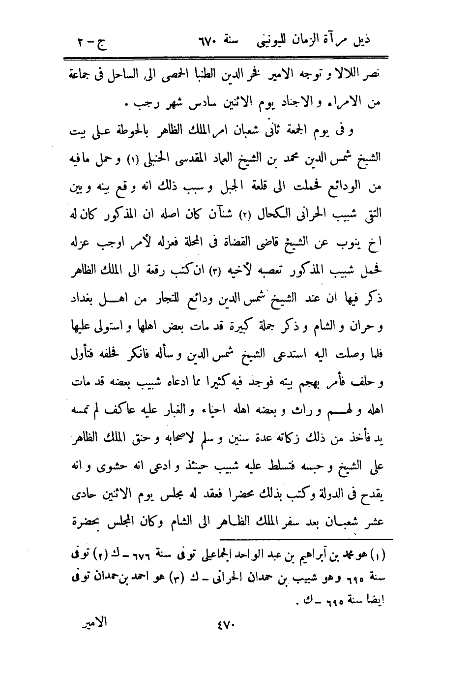 وفي يوم الجمعة ثاني شعبان أمر الملك الظاهر بالحوطة على بيت الشيخ شمس الدين محمد بن الشيخ العماد المقدسي الحنبلي وحمل ما فيه من الودائع فحملت إلى قلعة الجبل وسبب ذلك أنه وقع بينه وبين التقي شبيب الحراني الكحال شنآن كان أصله أن المذكور كان له أخ ينوب عن الشيخ قاضي القضاة في المحلة فعزله لأمر أوجب عزله فحمل شبيب المذكور تعصبه لأخيه أن كتب رقعة إلى الملك الظاهر ذكر فيها أن عند الشيخ شمس الدين ودائع للتجار من أهل بغداد وحران والشام وذكر جملة كبيرة قد مات بعض أهلها واستولى عليها فلما وصلت إليه استدعي الشيخ شمس الدين وسأله فأنكر فحلفه فتأول وحلف فأمر بهجم بيته فوجد فيه كثيراً مما ادعاه شبيب بعضه قد مات أهله ولهم وراث وبعضه أهله أحياء والغبار عليه عاكف لم تمسه يد فأخذ من ذلك زكاته عدة سنين وسلم لأصحابه وحنق الملك الظاهر على الشيخ وحبسه فتسلط عليه شبيب حينئذ وادعى أنه حشوي وأنه يقدح في الدولة وكتب بذلك محضراً فعقد له مجلس يوم الاثنين حادي عشر شعبان بعد سفر الملك الظاهر إلى الشام وكان المجلس بحضرة
