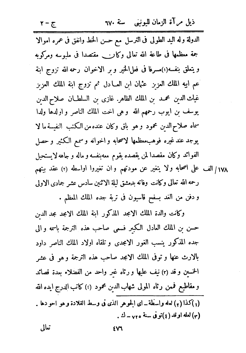 الدولة وله اليد الطولى في الترسل مع حسن الخط وأنفق في عمره أموالاً جمة معظمها في طاعة الله تعالى وكان مقتصداً في ملبوسه ومركوبه ويتعلق بنفسه مسرفاً في فعل الخير وبر الإخوان رحمه الله تزوج ابنة عم أبيه الملك العزيز عثمان ابن العادل ثم تزوج ابنة الملك العزيز غياث الدين محمد بن الملك الظاهر. غازي بن السلطان صلاح الدين يوسف بن أيوب رحمهم الله وهي أخت الملك الناصر وأولدها ولداً سماه صلاح الدين محمود وهو باق وكان عنده من الكتب النفيسة ما لا يوجد عنده غيره فوهب معظمها لأصحابه وإخوانه وسمع الكثير وحصل الفوائد وكان مقصداً لمن يقصده يقوم معه بنفسه وماله وجاهه لا يستحيل على أصحابه ولا يتغير عن مودتهم وإن تغيروا أواسطه عقد بيتهم رحمه الله تعالى وكانت وفاته بدمشق ليلة الاثنين سادس عشر جمادى الأولى ودفن من الغد بسفح قاسيون في تربة جده الملك المعظم.