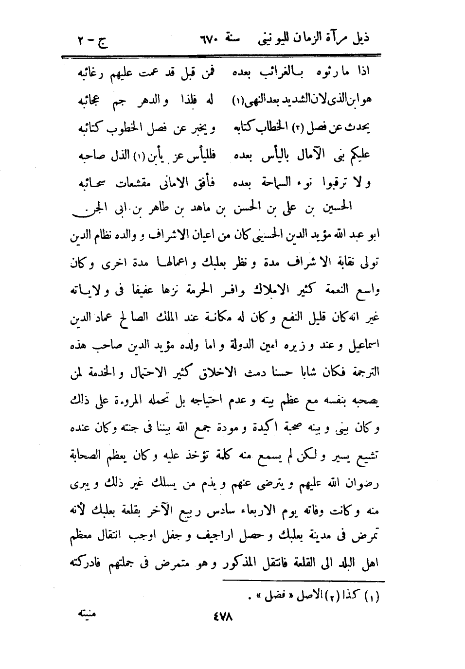 الحسين بن علي بن الحسن بن ماهد بن طاهر بن أبي الجن أبو عبد الله مؤيد الدين الحسيني كان من أعيان الأشراف ووالده نظام الدين تولى نقابة الأشراف مدة ونظر بعلبك وأعمالها مدة أخرى وكان وأسع النعمة كثير الأملاك وافر الحرمة نزهاً عفيفاً في ولاياته غير أنه كان قليل النفع وكان له مكانة عند الملك الصالح عماد الدين إسماعيل وعند وزيره أمين الدولة وأما ولده مؤيد الدين صاحب هذه الترجمة فكان شاباً حسن دمث الأخلاق كثير الاحتمال والخدمة لم يصحبه بنفسه مع عظم بيته وعدم احتياجه بل تحمله المروءة على ذلك وكان بيني وبينه صحبة أكيدة ومودة جمع الله بيننا في جنته وكان عنده تشيع يسر ولكن لم يسمع منه كلمة تؤخذ عليه وكان يعظم الصحابة رضوان الله عليهم ويترضى عنهم ويذم من يسلك غير ذلك ويبري منه وكانت وفاته يوم الأربعاء سادس ربيع الآخر بقلعة بعلبك لأنه تمرض في مدينة بعلبك وحصل أراجيف وجفل أوجب انتقال معظم أهل البلد إلى القلعة فانتقل المذكور وهو متمرض في جملتهم فأدركته
