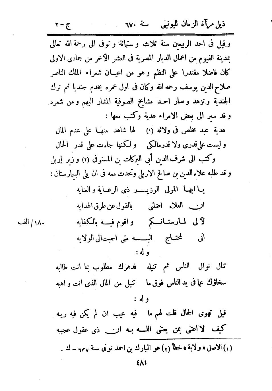 وكتب إلى شرف الدين أبي البركات بن المستوفي وزير إربل وقد طلبه علاء الدين بن صالح الأربلي وتحدث معه في أن يلي البيمارستان: