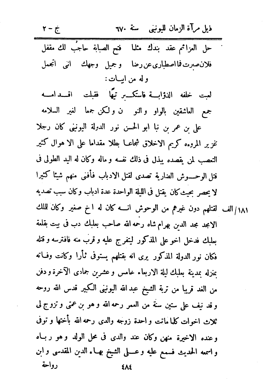 علي بن عمر بن نبا أبو الحسن نور الدولة اليونيني كان رجلاً غزير المروءة كريم الأخلاق شجاعاً بطلاً مقداماً على الأهوال كثير التعصب لمن يقصده يبذل في ذلك نفسه وماله وكان له اليد الطولى في قتل الوحوش الضارية تصدى لتقل الأدباب فأفنى منهم شيئاً كثيراً لا يحصر بحيث كان يقتل في الليلة الواحدة عدة أدباب وكان سبب تصديه لقتلهم دون غيرهم من الوحوش أنه كان له أخ صغير وكان للملك الأمجد مجد الدين بهرام شاه رحمه الله صاحب بعلبك دب في بيت بقلعة بعلبك فدخل أخو علي المذكور ليتفرج عليه وقرب منه فافترسه وقتله فكان نور الدولة المذكور يرى أنه يقتلهم يستوفي ثأراً وكانت وفاته بمنزله بمدينة بعلبك ليلة الأربعاء خامس وعشرين جمادى الآخرة ودفن من الغد قريباً من تربة الشيخ عبد الله اليونيني الكبير قدس الله روحه وقد نيف على ستين سنة من العمر رحمه الله وهو بن عمتي وتزوج لي ثلاث أخوات كلما ماتت واحدة زوجه والدي رحمه الله بأختها وتوفي وعنده الأخيرة منهن وكان عند والدي في محل الولد وهو رباه وأسمعه الحديث فسمع عليه وعلى الشيخ بهاء الدين المقدسي وابن