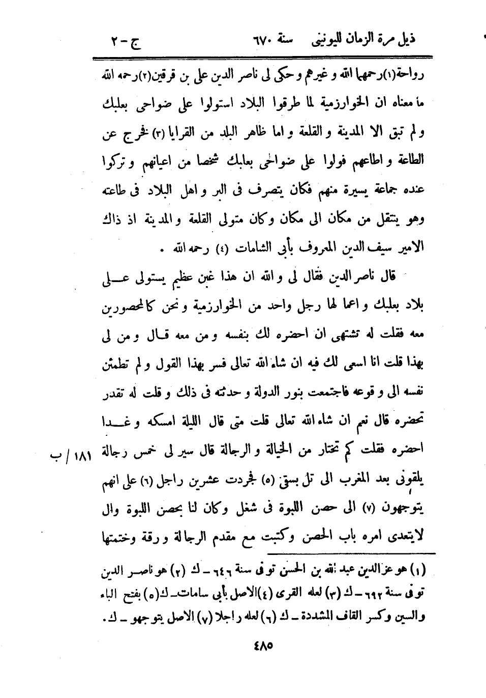 رواحة رحمهما الله وغيرهم وحكى لي ناصر الدين علي بن قرقين رحمه الله ما معناه أن الخوارزمية لما طرقوا البلاد استولوا على ضواحي بعلبك ولم تبق إلا المدينة والقلعة وأما ظاهر البلد من القرايا فخرج عن الطاعة وأطاعهم فولوا على ضواحي بعلبك شخصاً من أعيانهم وتركوا عنده جماعة يسيرة منهم فكان يتصرف في البر وأهل البلاد في طاعته وهو ينتقل من مكان إلى مكان وكان متولي القلعة والمدينة إذ ذاك الأمير سيف الدين المعروف بأبي الشامات رحمه الله.