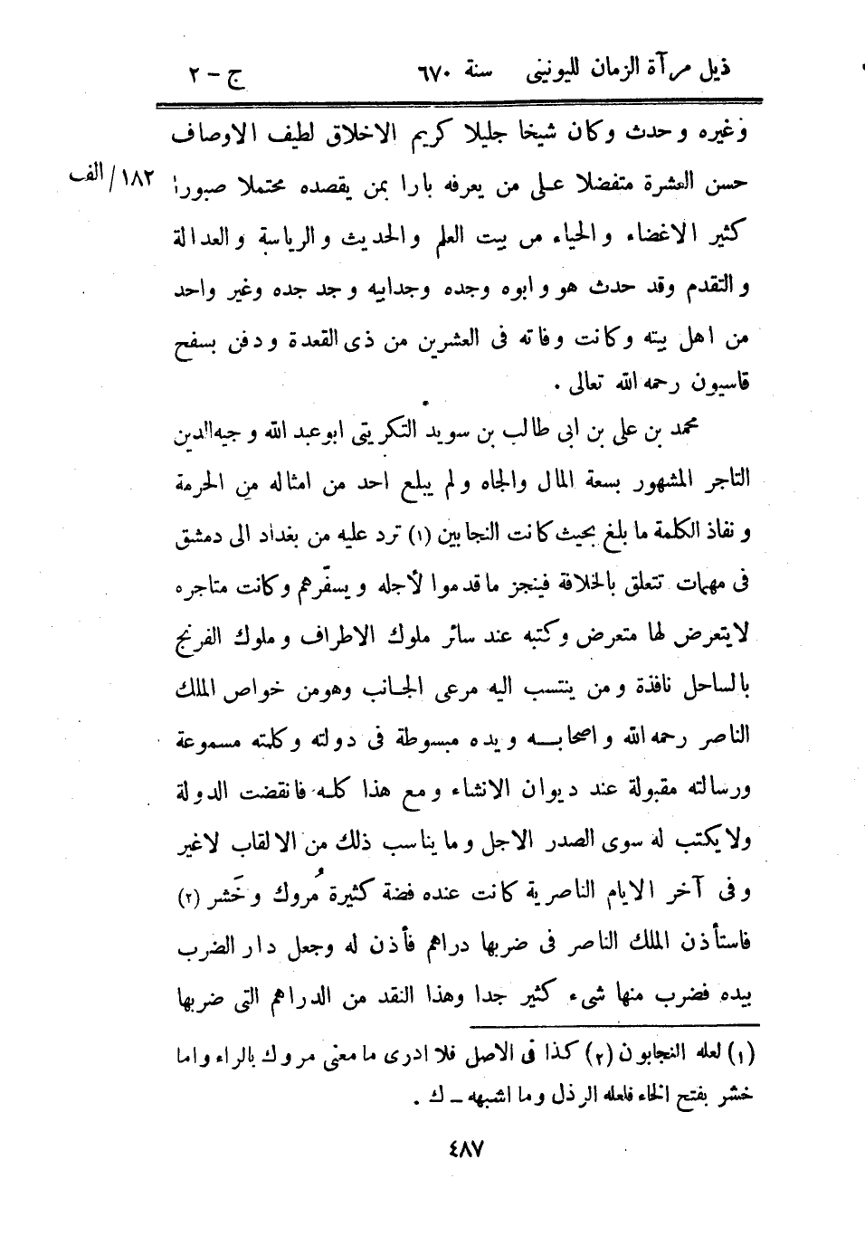 محمد بن علي بن أبي طالب بن سويد التكريتي أبو عبد الله وجيه الدين التاجر المشهور بسعة المال والجاه ولم يبلغ أحد من أمثاله من الحرمة ونفاذ الكلمة ما بلغ بحيث كانت النجابين ترد عليه من بغداد إلى دمشق في مهمات تتعلق الخلافة فينجز ما قدموا لأجله ويسفرهم وكانت متاجره لا يتعرض لها متعرض وكتبه عند سائر ملوك الأطراف وملوك الفرنج بالساحل نافذة ومن ينتسب إليه مرعي الجانب وهو من خواص الملك الناصر رحمه الله وأصحابه ويده مبسوطة في دولته وكلمته مسموعة ورسالته مقبولة عند ديوان الإنشاء ومع هذا كله فانقضت الدولة ولا يكتب له سوى الصدر الأجل وما يناسب ذلك من الألقاب لا غير وفي آخر الأيام الناصرية كانت عنده فضة كثيرة مروك وخشر فاستأذن الملك الناصر في ضربها دراهم فأذن له وجعل دار الضرب بيده فضرب منه شيء كثير جداً وهذا النقد من الدراهم التي ضربها