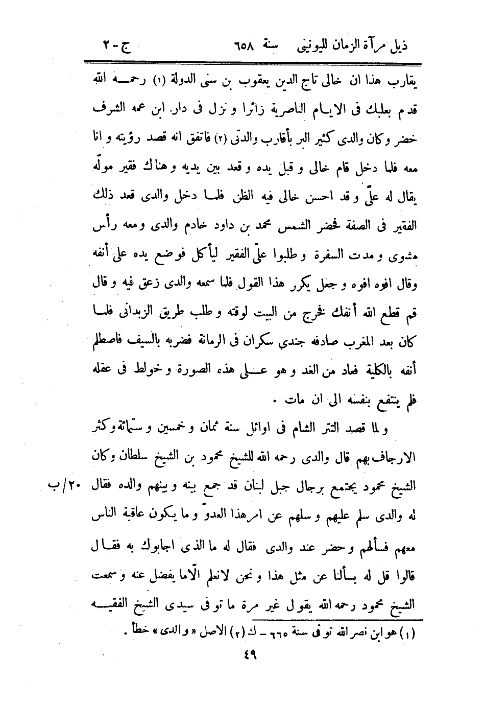 ولما قصد التتر الشام في أوائل سنة ثمان وخمسين وستمائة وكثر الإرجاف بهم قال والدي رحمه الله للشيخ محمود بن الشيخ سلطان وكان الشيخ محمود يجتمع برجال لبنان قد جمع بينه وبينهم والده فقال له والدي سلم عليهم وسلهم عن أمر هذا العدو وما يكون عاقبة الناس معهم فسألهم وحضر عند والدي فقال له ما الذي أجابوك به فقال قالوا قل له يسألنا عن مثل هذا ونحن لا نعلم إلا ما يفضل عنه وسمعت الشيخ محمود رحمه الله يقول غير مرة ما توفي سيدي الشيخ الفقيه