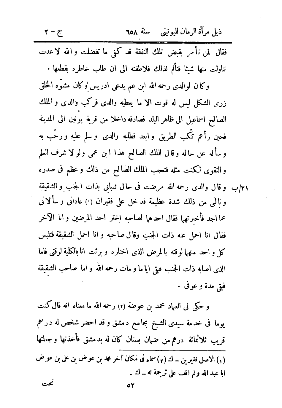 وكان لوالدي رحمه الله ابن عم يدعى إدريس وكان مشوه الخلق زري الشكل ليس له قوت إلا ما يعطيه والدي فركب والدي والملك الصالح إسماعيل إلى ظاهر البلد فصادفه داخلاً من قرية يونين إلى المدينة فحين رأهم تنكب الطريق وأبعد فطلبه والدي وسلم عليه ورحب به وسأله عن حاله وقال للملك الصالح هذا ابن عمي ولولا شرف العلم والتقوى لكنت مثله فتعجب الملك الصالح من ذلك وعظم في صدره وقال والدي رحمه الله مرضت في حال شبابي بذات الجنب والشقيقة ونالني من ذلك شدة عظيمة فدخل علي فقيران عاداني وسألاني عما أجد فأخبرتهما فقال أحدهما لصاحبه اختر أحد المرضين وأنا الآخر فقال أنا أحمل عنه ذات الجنب وقال صاحبه وأنا أحمل الشقيقة فتلبس كل واحد منهما لوقته بالمرض الذي اختاره وبرئت أنا بالكلية لوقتي فأما الذي أصابه ذات الجنب فبقي أياماً ومات رحمه الله وأما صاحب الشقيقة فبقي مدة وعوفى.