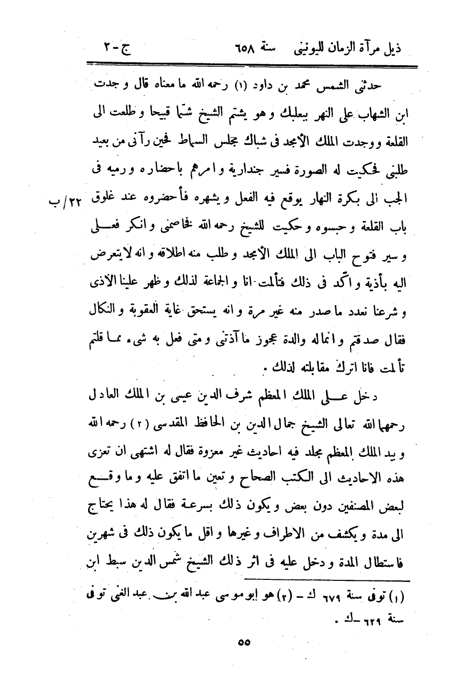 حدثني الشمس محمد بن داود رحمه الله ما معناه قال وجدت ابن الشهاب على النهر ببعلبك وهو يشتم الشيخ شتماً قبيحاً وطلعت إلى القلعة ووجدت الملك الأمجد في شباك مجلس السماط فحين رآني من بعيد طلبني فحكيت له الصورة فسير جندارية وأمرهم بإحضاره ورميه في الجب إلى بكرة النهار يوقع فيه الفعل ويشهره فأحضروه عند غلوق باب القلعة وحبسوه وحكيت للشيخ رحمه الله فخاصمني وأنكر فعلي وسير فتوح الباب إلى الملك الأمجد وطلب منه إطلاقه وأنه لا يتعرض إليه بأذية وأكد في ذلك فتألمت أنا والجماعة لذلك وظهر علينا الأذى وشرعنا نعدد ما صدر منه غير مرة وأنه يستحق غاية العقوبة والنكال فقال صدقتم وإنما له والدة عجوز ما آذتني ومتى فعل به شيء مما قلتم تألمت فأنا أترك مقابلته لذلك.