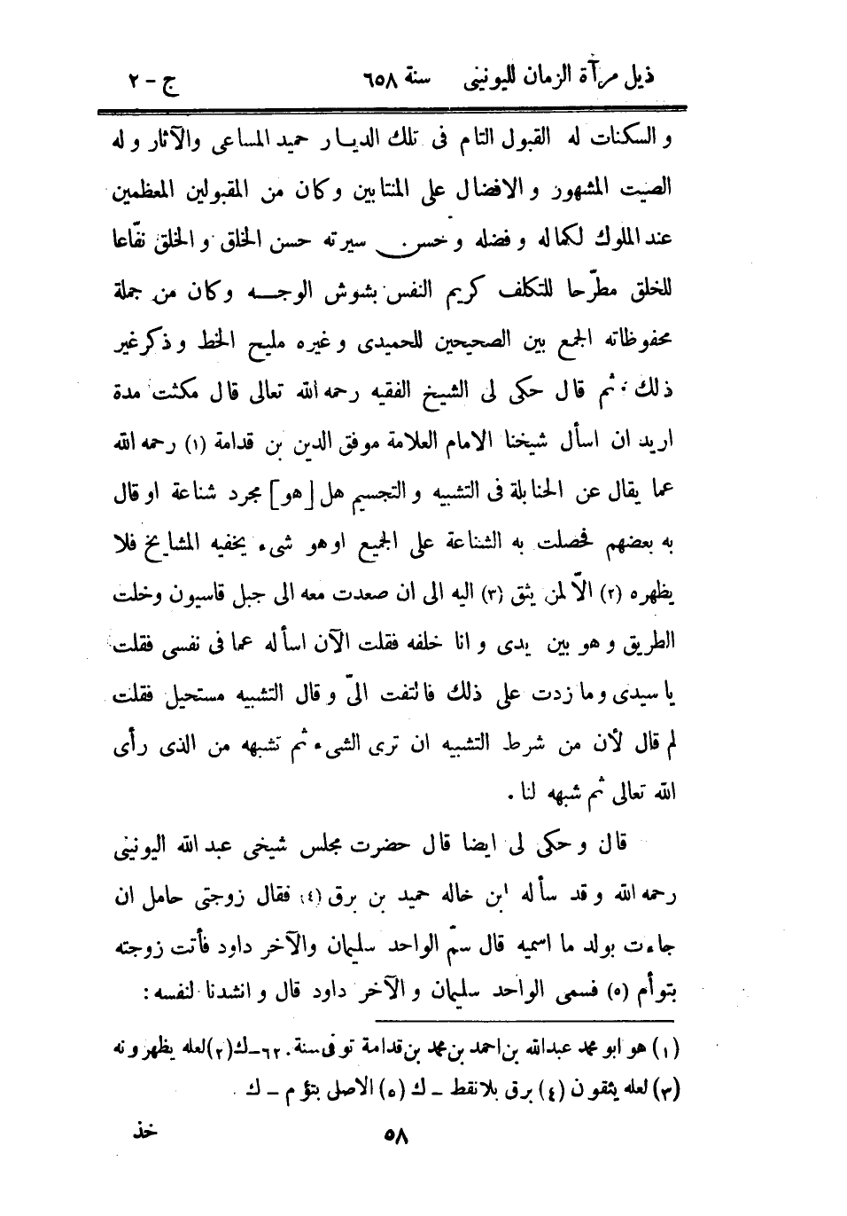 قال وحكى لي أيضاً قال حضرت مجلس شيخي عبد الله اليونيني رحمه الله وقد سأله ابن خاله حميد بن برق فقال زوجتي حامل إن جاءت بولد ما اسميه قال سم الواحد سليمان والآخر داود فأتت زوجته بتوأم فسمى الواحد سلميان والآخر داود قال وأنشدنا لنفسه: