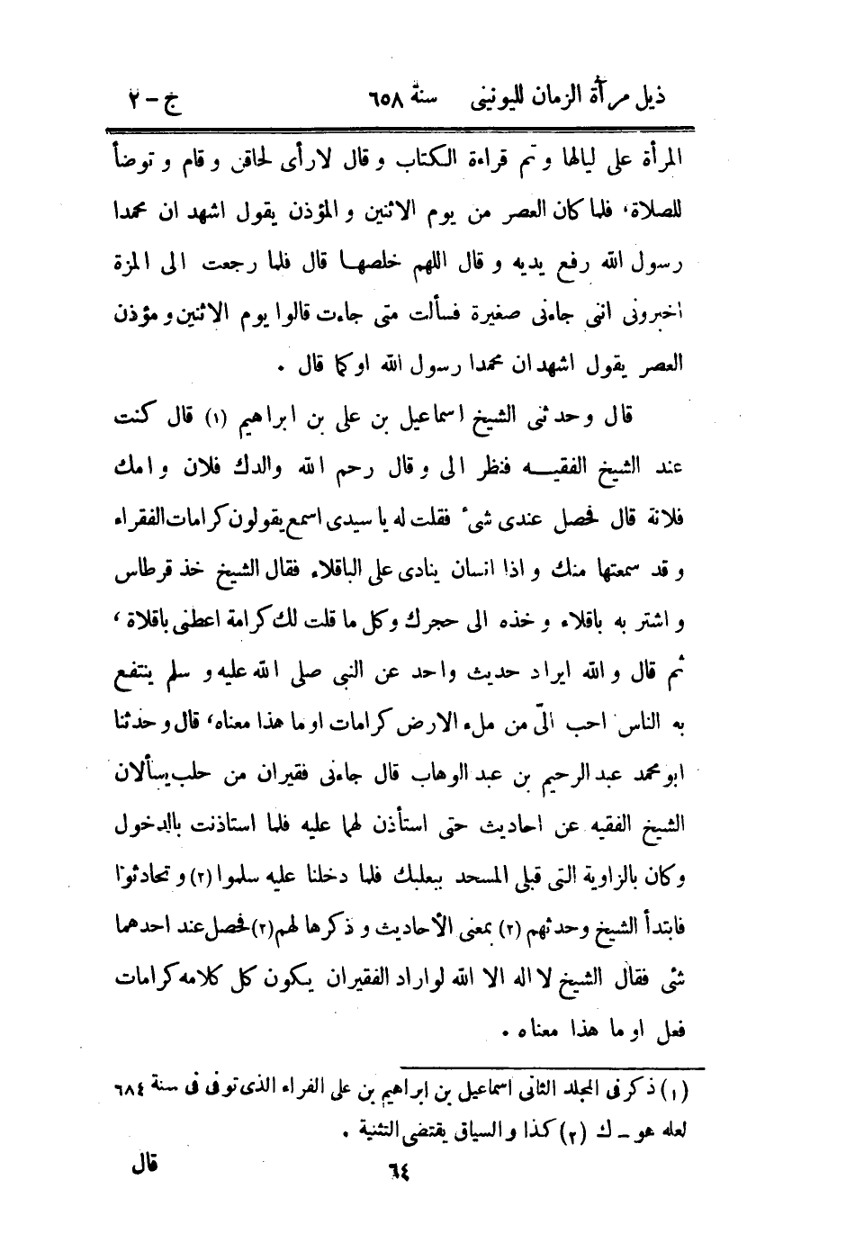 قال وحدثني الشيخ إسماعيل بن علي بن إبراهيم قال كنت عند الشيخ الفقيه فنظر إلي وقال رحم الله والدك فلان وأمك فلانة قال فحصل عندي شيء فقلت له يا سيدي اسمع يقولون كرامات الفقراء وقد سمعتها منك وإذا إنسان ينادي على الباقلاء فقال الشيخ خذ قرطاس واشتر به باقلاء وخذه إلى حجرك وكل ما قلت لك كرامة أعطني باقلاه، ثم قال والله أيراد حديث واحد عن النبي صلى الله عليه وسلم ينتفع به الناس أحب إلي من ملء الأرض كرامات أو ما هذا معناه، قال وحدثنا أبو محمد عبد الرحيم بن عبد الوهاب قال جاءني فقيران من حلب يسالان الشيخ الفقيه عن أحاديث حتى استأذن لهما عليه فلما استأذنت بالدخول وكان بالزاوية التي قبلي المسجد ببعلبك فلما دخلنا عليه سلموا وتحادثوا فابتدأ الشيخ وحدثهم بمعنى الأحاديث وذكرها لهم فحصل عند أحدهما شيء فقال الشيخ لا إله إلا الله لو أراد الفقيران يكون كل كلامه كرامات فعل أو ما هذا معناه.