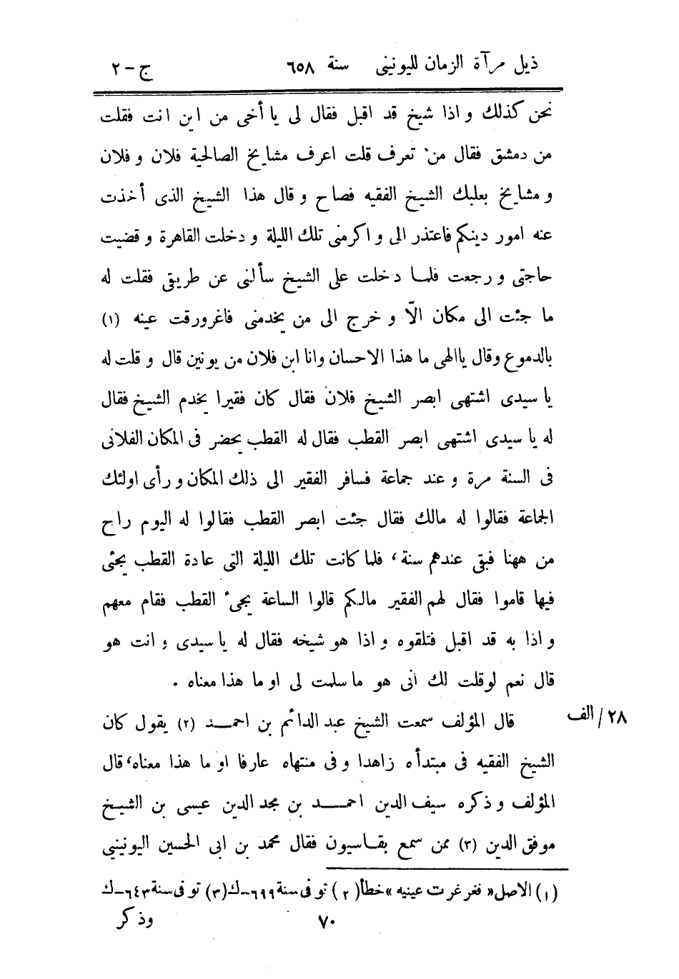 نحن كذلك وإذا شيخ قد أقبل فقال لي يا أخي من أين أنت فقلت من دمشق فقال من تعرف قلت أعرف مشايخ الصالحية فلان وفلان ومشايخ بعلبك الشيخ الفقيه فصاح وقال هذا الشيخ الذي أخذت عنه أمور دينكم فاعتذر إلي وأكرمني تلك الليلة ودخلت القاهرة وقضيت حاجتي ورجعت فلما دخلت على الشيخ سألني عن طريقي فقلت له ما جئت إلى مكان إلا وخرج إلي من يخدمني فاغرورقت عينه بالدموع وقال يا إلهي ما هذا الإحسان وأنا ابن فلان من يونين قال وقلت له يا سيدي اشتهى أبصر الشيخ فلان فقال كان فقيراً يخدم الشيخ فقال له يا سيدي اشتهى أبصر القطب فقال له القطب يحضر في المكان الفلاني في السنة مرة وعند جماعة فسافر الفقير إلى ذلك المكان ورأى أولئك الجماعة فقالوا له مالك فقال جئت أبصر القطب فقالوا له اليوم راح من ههنا فبقي عندهم سنة، فلما كانت تلك الليلة التي عادة القطب يجئ فيها قاموا فقال لهم الفقير ما لكم قالوا الساعة يجيء القطب فقام معهم وإذا به قد أقبل فتلقوه وإذا هو شيخه فقال له يا سيدي وأنت هو قال نعم لو قلت لك إني هو ما سلمت لي أو ما هذا معناه.