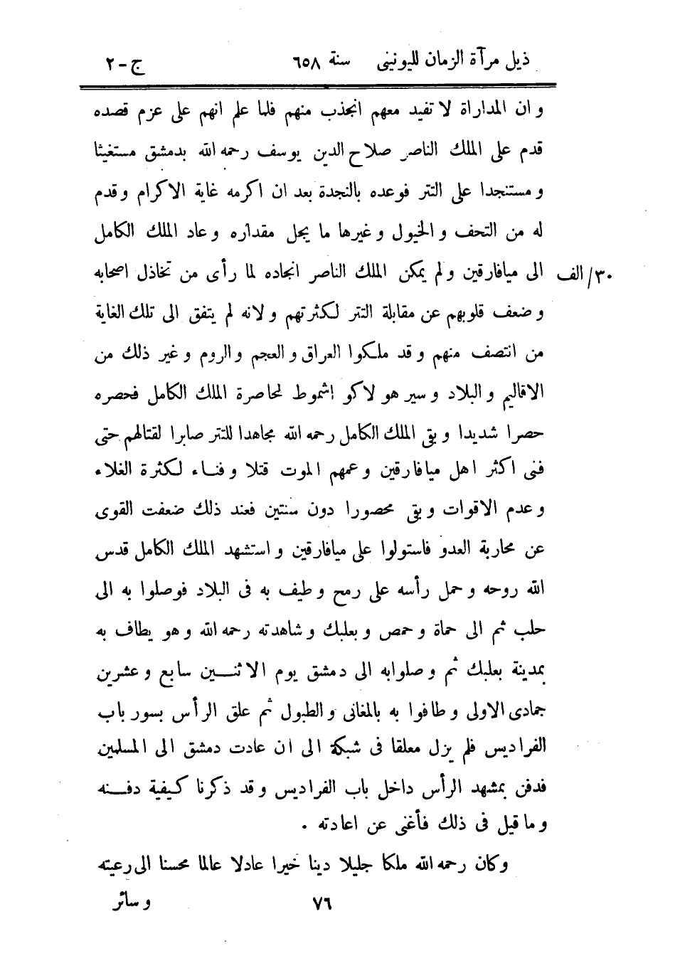 وأن المداراة لا تفيد معهم انجذب منهم فلما علم أنهم على عزم قصده قدم على الملك الناصر صلاح الدين يوسف رحمه الله بدمشق مستغيثاً ومستنجداً على التتر فوعده بالنجدة بعد أن أكرمه غاية الإكرام وقدم له من التحف والخيول وغيرها ما يجل مقداره وعاد الملك الكامل إلى ميافارقين ولم يمكن الملك الناصر إنجاده لما رأى من تخاذل أصحابه وضعف قلوبهم عن مقابلة التتر لكثرتهم ولأنه لم يتفق إلى تلك الغاية من انتصف منهم وقد ملكوا العراق والعجم والروم وغير ذلك من الأقاليم والبلاد وسير هولاكو أشموط لمحاصرة الملك الكامل فحصره حصراً شديداً وبقي الملك الكامل رحمه الله مجاهداً للتتر صابراً لقتالهم حتى فني أكثر أهل ميافارقين وعمهم الموت قتلاً وفناء لكثرة الغلاء وعدم الأقوات وبقي محصوراً دون سنتين فعند ذلك ضعفت القوى عن محاربة العدو فاستولوا على ميافارقين واستشهد الملك الكامل قدس الله روحه وحمل رأسه على رمح وطيف به في البلاد فوصلوا به إلى حلب ثم إلى حماة وحمص وبعلبك وشاهدته رحمه الله وهو يطاف به بمدينة بعلبك ثم وصلوا به إلى دمشق يوم الاثنين سابع وعشرين جمادى الأولى وطافوا به بالمغاني والطبول ثم علق الرأس بسور باب الفراديس فلم يزل معلقاً في شبكة إلى أن عادت دمشق إلى المسلمين فدفن بمشهد الرأس داخل باب الفراديس وقد ذكرنا كيفية دفنه وما قيل في ذلك فأغنى عن إعادته.
