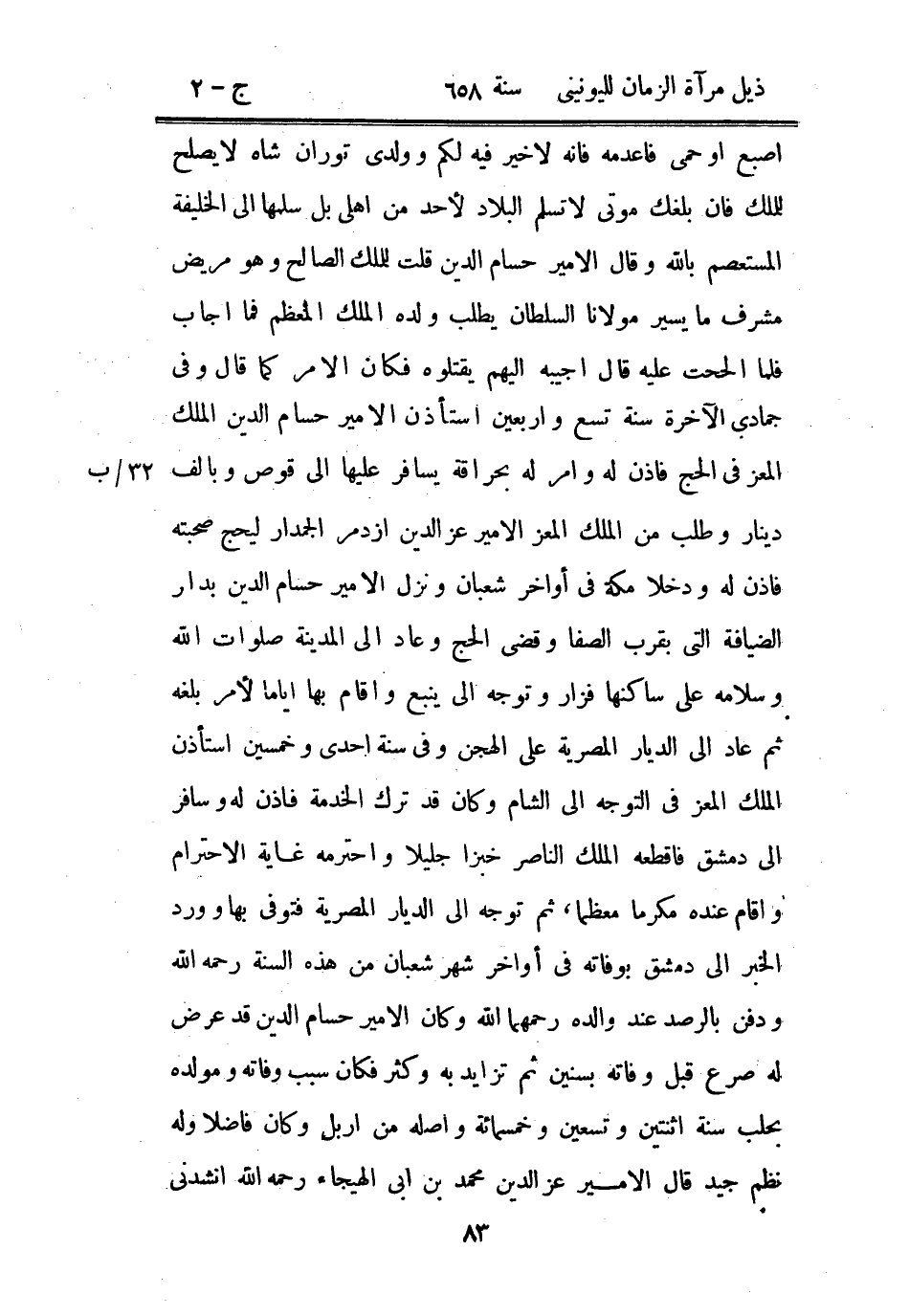 إصبع أو حمى فاعدمه فإنه لا خير فيه لكم وولدي توران شاه لا يصلح للملك فإن بلغك موتي لا تسلم البلاد لأحد من أهلي بل سلمها إلى الخليفة المستعصم بالله وقال الأمير حسام الدين قلت للملك الصالح وهو مريض مشرف ما يسير مولانا السلطان يطلب ولده الملك المعظم فما أجاب فلما ألححت عليه قال أجيبه إليهم يقتلوه فكان الأمر كما قال وفي جمادى الآخرة سنة تسع وأربعين استأذن الأمير حسام الدين الملك المعز في الحج فأذن له وأمر له بحراقة يسافر عليها إلى قوص وبألف دينار وطلب من الملك المعز الأمير عز الدين أزدمر الجمدار ليحج صحبته فأذن له ودخلا مكة في أواخر شعبان ونزل الأمير حسام الدين بدار الضيافة التي بقرب الصفا وقضى الحج وعاد إلى المدينة صلوات الله وسلامة على ساكنها فزار وتوجه إلى ينبع وأقام بها أياماً لأمر بلغه ثم عاد إلى الديار المصرية على الهجن وفي سنة إحدى وخمسين استأذن الملك المعز في التوجه إلى الشام وكان قد ترك الخدمة فأذن له وسافر إلى دمشق فاقطعه الملك الناصر خبزاً جليلاً واحترمه غاية الاحترام وقام عنده مكرماً معظماً، ثم توجه إلى الديار المصرية فتوفي بها وورد الخبر إلى دمشق بوفاته في أواخر شهر شعبان من هذه السنة رحمه الله ودفن بالرصد عند والده رحمهما الله وكان الأمير حسام الدين قد عرض له صرع قبل وفاته بسنين ثم تزايد به وكثر فكان سبب وفاته ومولده بحلب سنة اثنتين وتسعين وخمسمائة وأصله من إربل وكان فاضلاً وله نظم جيد قال الأمير عز الدين محمد بن أبي الهيجاء رحمه الله أنشدني