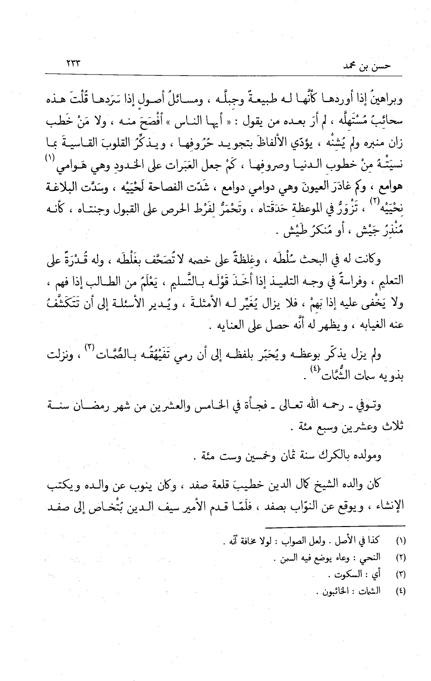 وبراهين إذا أوردها كأنها له طبيعة وجبله، ومسائل أصول إذا سردها قلت هذه سحائب مستهله، لم أر بعده من يقول: أيها الناس أفصح منه، ولا من خطب زان منبره ولم يشنه، يؤدي الألفاظ بتجويد حروفها، ويذكر القلوب القاسية بما نسيته من خطوب الدنيا وصروفها، كم جعل العبرات على الخدود وهي هوامي هوامع، وكم غادر العيون وهي دوامي دوامع، شدت الفصاحة لحييه، وسدت البلاغة نحييه، تزور في الموعظة حدقتاه، وتحمر لفرط الحرص على القبول وجنتاه، كأنه منذر جيش، أو منكر طيش.