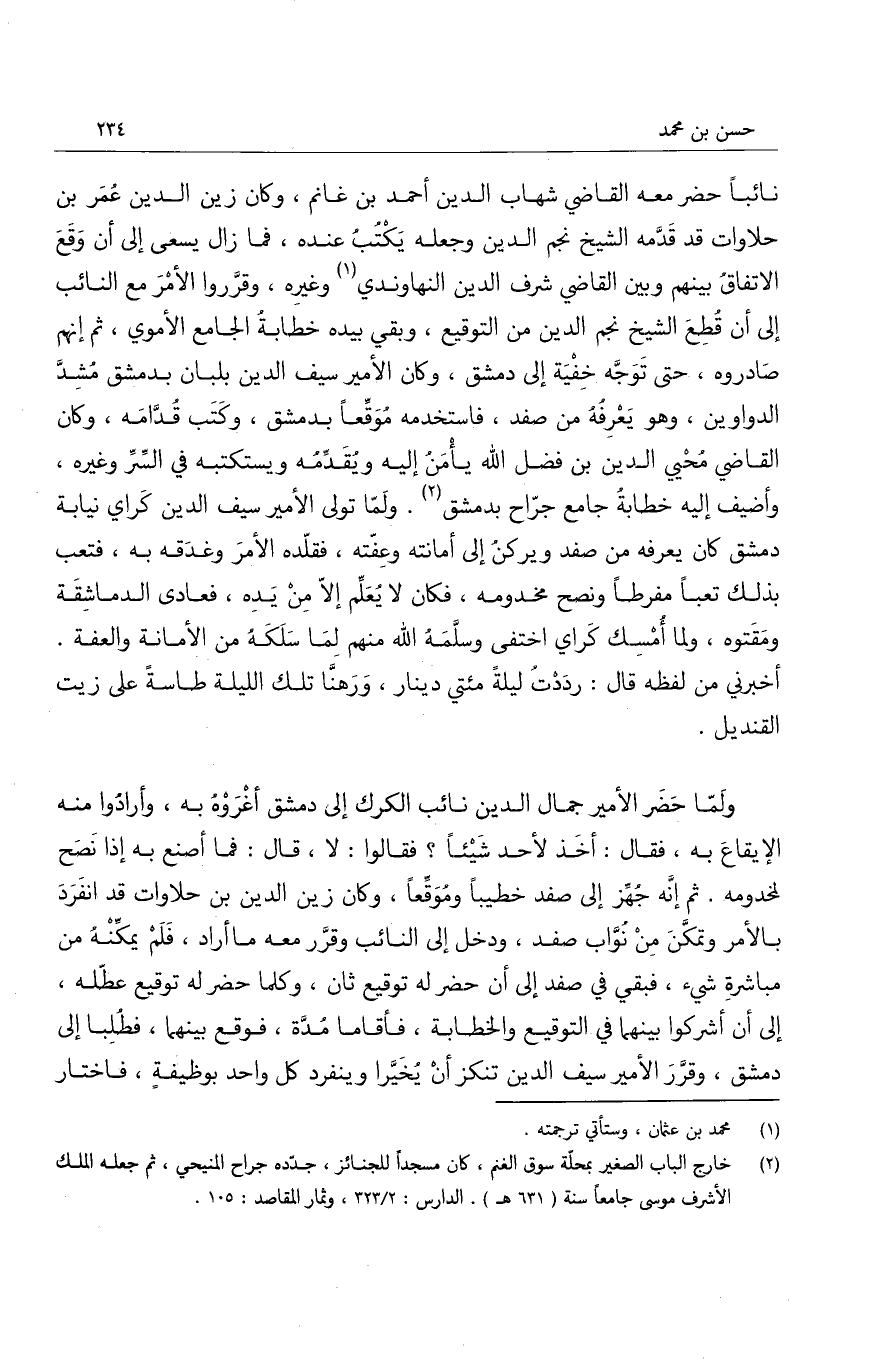 نائباً حضر معه القاضي شهاب الدين أحمد بن غانم، وكان زين الدين عمر بن حلاوات قد قدمه الشيخ نجم الدين وجعله يكتب عنده، فما زال يسعى إلى أن وقع الاتفاق بينهم وبين القاضي شرف الدين النهاوندي وغيره، وقرروا الأمر مع النائب إلى أن قطع الشيخ نجم الدين من التوقيع، وبقي بيده خطابة الجامع الأموي، ثم إنهم صادروه، حتى توجه خفية إلى دمشق، وكان الأمير سيف الدين بلبان بدمشق مشد الدواوين، وهو يعرفه من صفد، فاستخدمه موقعاً بدمشق، وكتب قدامه، وكان القاضي محيي الدين بن فضل الله يأمن إليه ويقدمه ويستكتبه في السر وغيره، وأضيف إليه خطابة جامع جراح بدمشق. ولما تولى الأمير سيف الدين كراي نيابة دمشق كان يعرفه من صفد ويركن إلى أمانته وعفته، فقلده الأمر وغدقه به، فتعب بذلك تعباً مفرطاً ونصح مخدومه، فكان لا يعلم لا من يده، فعادى الدماشقة ومقتوه، ولما أمسك كراي اختفى وسلمه الله منهم لما سلكه من الأمانة والعفة. أخبرني من لفظه قال: رددت ليلةً مئتي دينار، ورهنا تلك الليلة طاسةً على زيت القنديل.