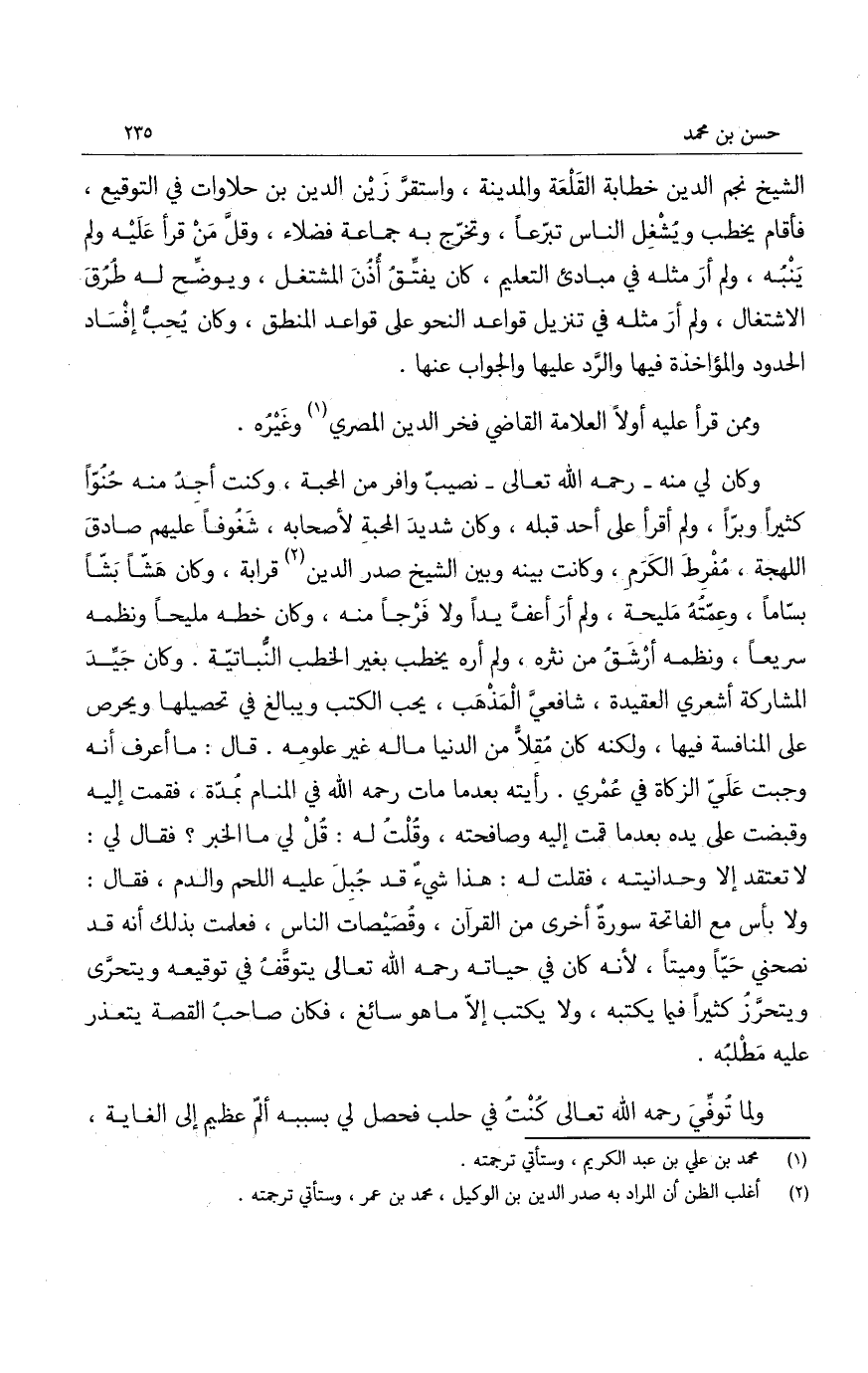 الشيخ نجم الدين خطابة القلعة والمدينة، واستقر زين الدين بن حلاوات في التوقيع، فأقام يخطب ويشغل الناس تبرعاً، وتخرج به جماعة فضلاء، وقل من قرأ عليه ولم ينبه، ولم أر مثل في مبادئ التعليم، كان يفتق أذن المشتغل، ويوضح له طرق الاشتغال، ولم أر مثله ف تنزيل قواعد النحو على قواع المنطق، وكان يحب إفساد الحدود والمؤاخذة فيها والرد عليها والجواب عنها.